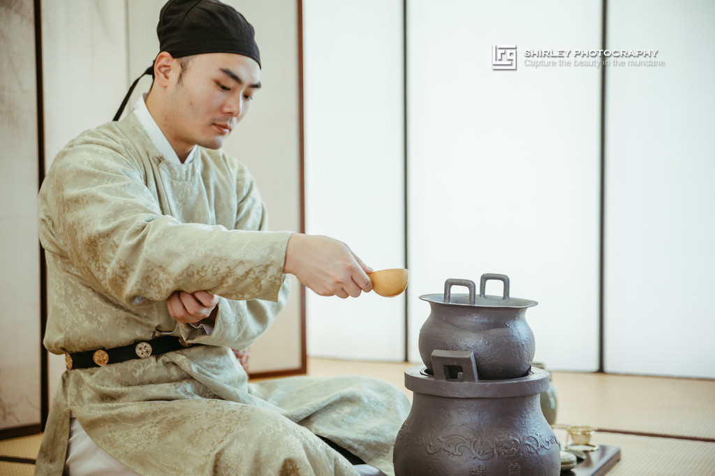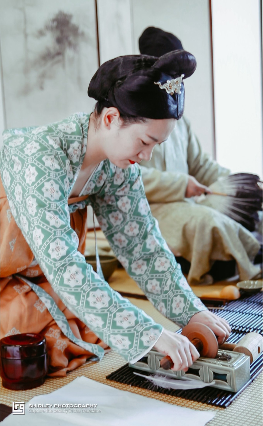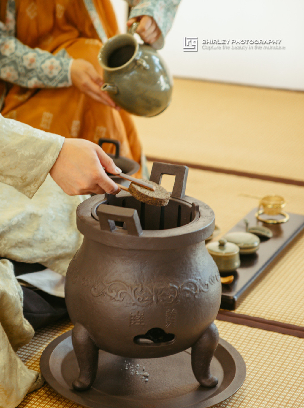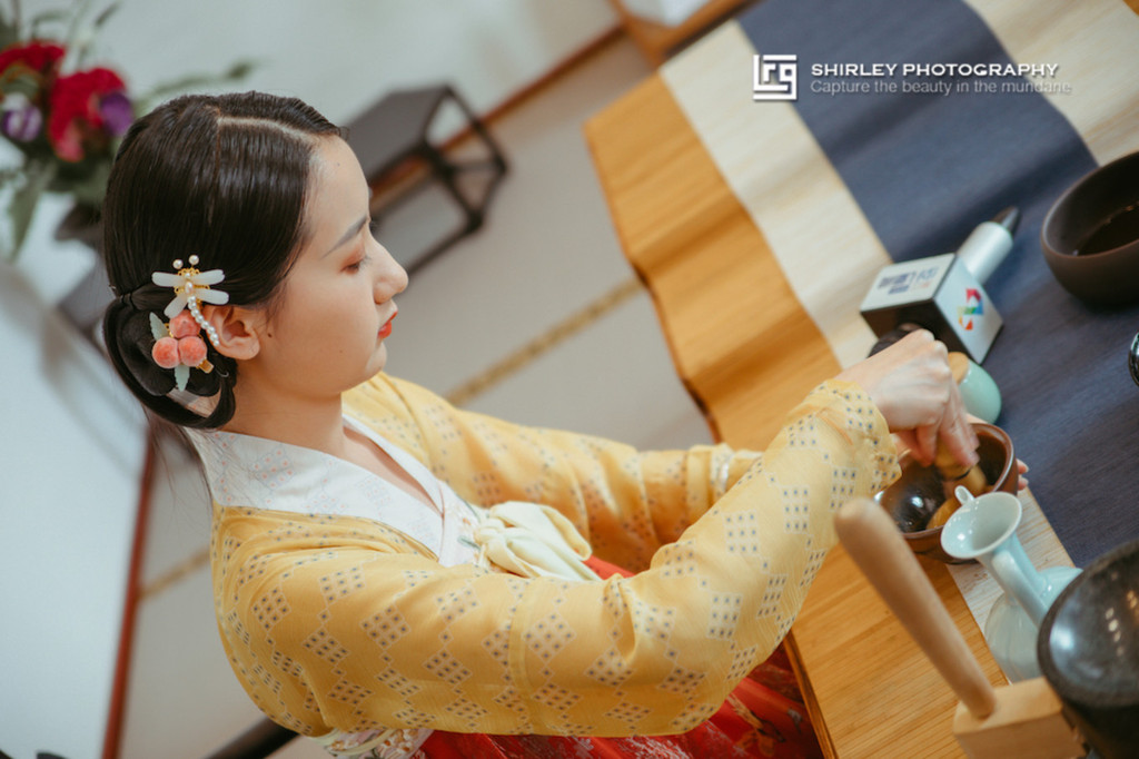 当天为所有人表演的两位茶艺师,已坐在山水屏风围绕的茶席间。男士身着唐圆领袍腰系革带,头戴唐男子最经典的首服幞头;女士则身穿小团花纹样的齐胸衫裙,发髻高耸;两人的一举一动赏心悦目,好像一个生动的唐代小剧场,与观众隔着两个不同的时空。