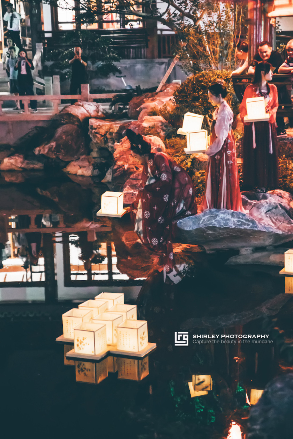 许多姑娘捧着刚做完的花灯,来到池塘边放花灯祈福。水面上花灯盏盏,影影绰绰,月色朦胧;古代的生活既简单朴素,又热闹非凡,今人亦沉醉其中。