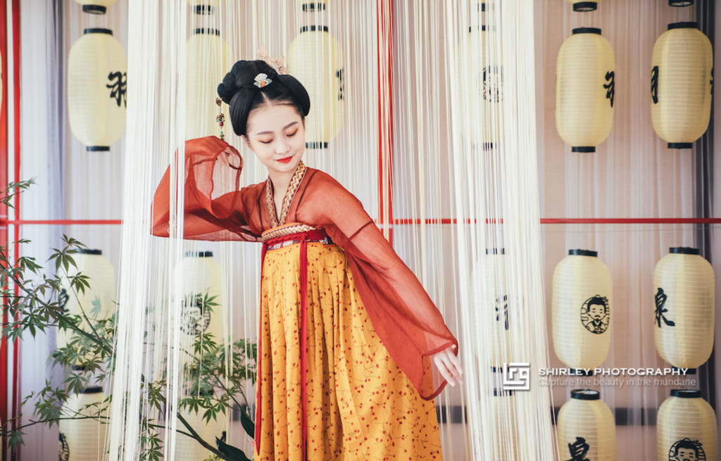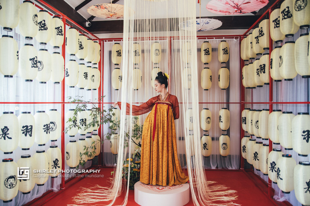入园后,就是用流苏帷幔和写有“陆羽泉”三字的古典灯笼布置的打卡点,充满大唐的华丽风韵。身着唐制汉服的模特一颦一笑,一举一动,都充满了古典韵味,赚足了大家的快门。
