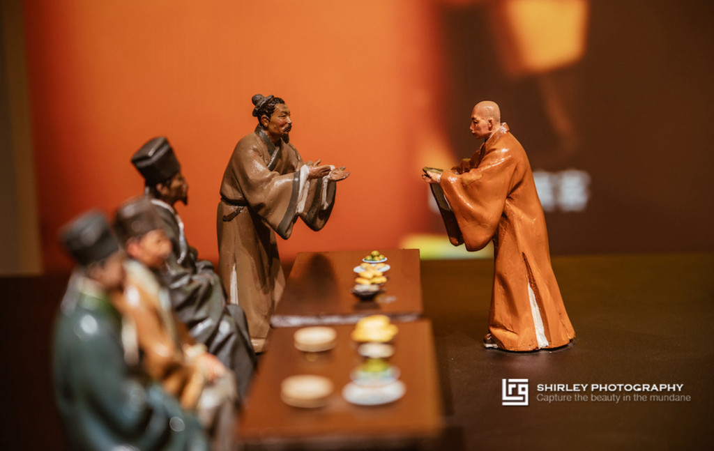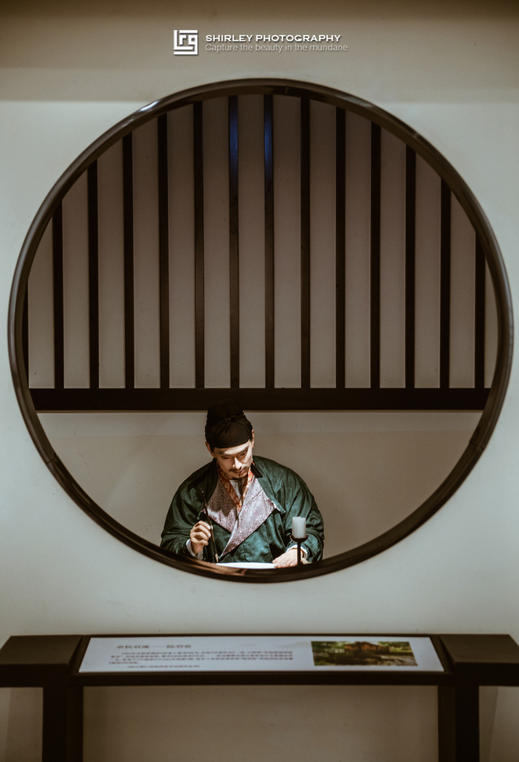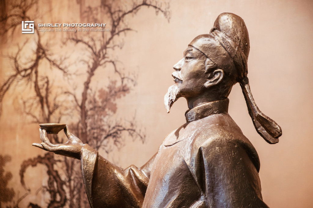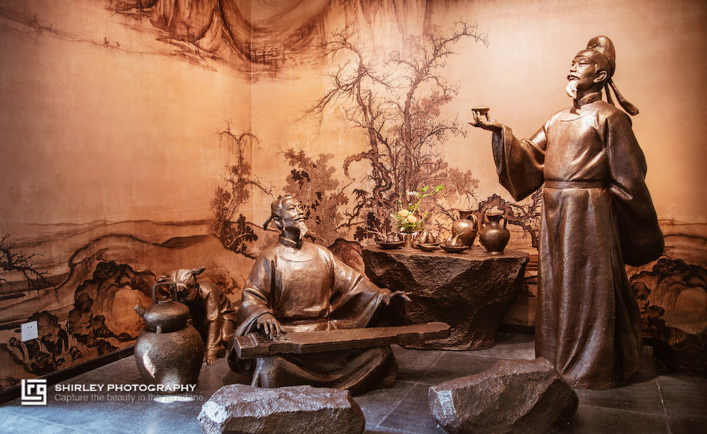 一层展厅尽头的圆形漏窗背后,便是身着唐服的陆羽塑像,正在提笔思考;也许千年前,他日日重复着这样的状态,直到《茶经》在石破天惊中问世。