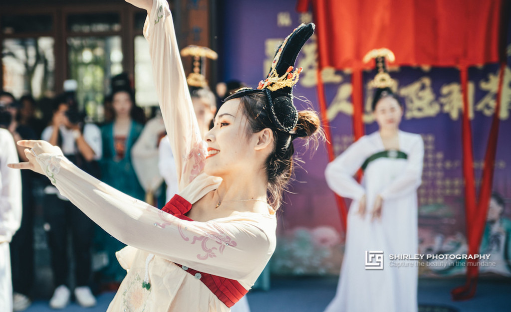 为了给游客沉浸式古风游园体验,我们去的当日入口就是国风古典群舞《丽人行》的演出,就是那个曾经惊艳过全网的舞蹈。身着古典服饰的舞者们,身段袅娜娉婷,风华绝代,完美还原了大唐迎宾礼。