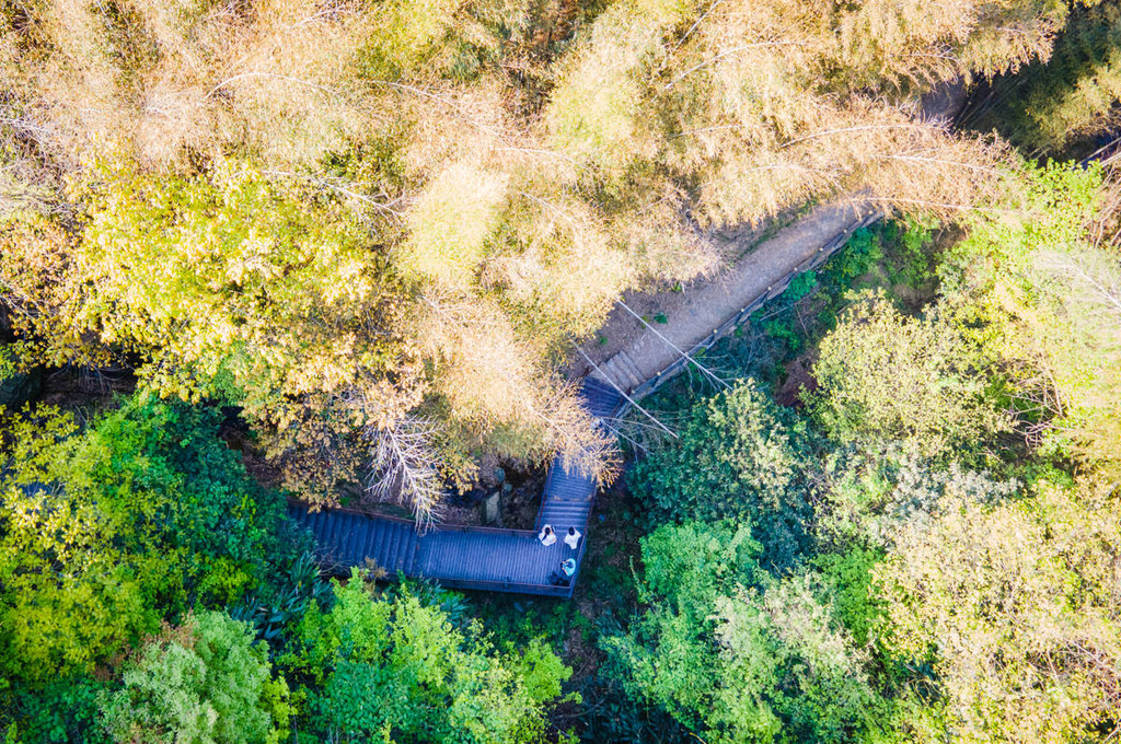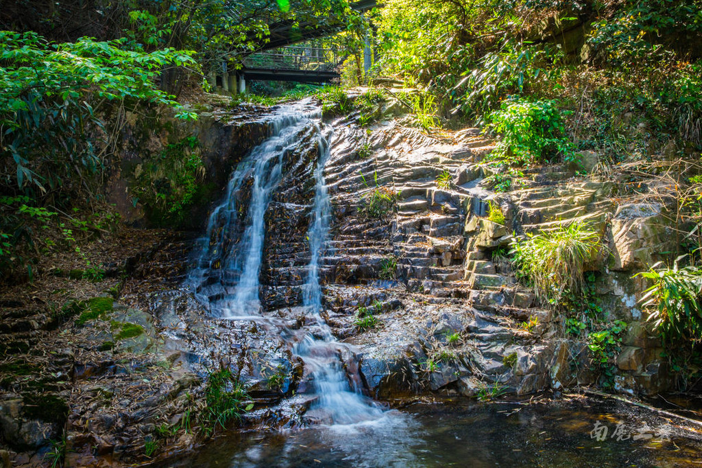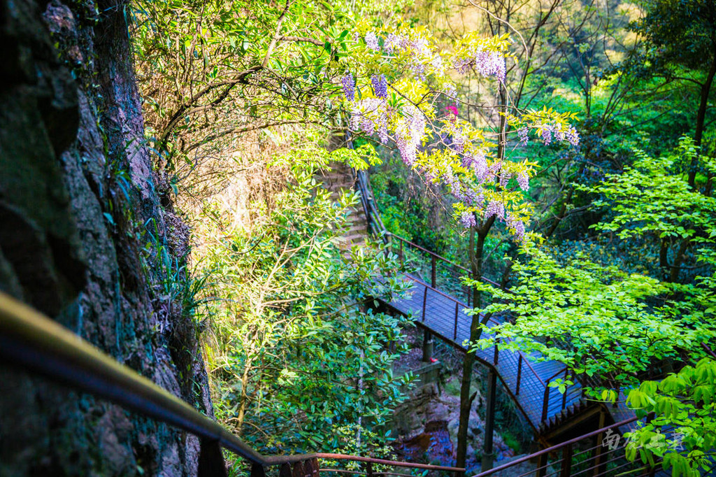 上山的石径有些陡峭,森林夹道和悬崖间,估计老路太艰险或是损坏,现在架起了木栈道,经常是从茂盛的蓝花楹下穿过,颇有些烂漫,感觉是户外徒步的理想路线。