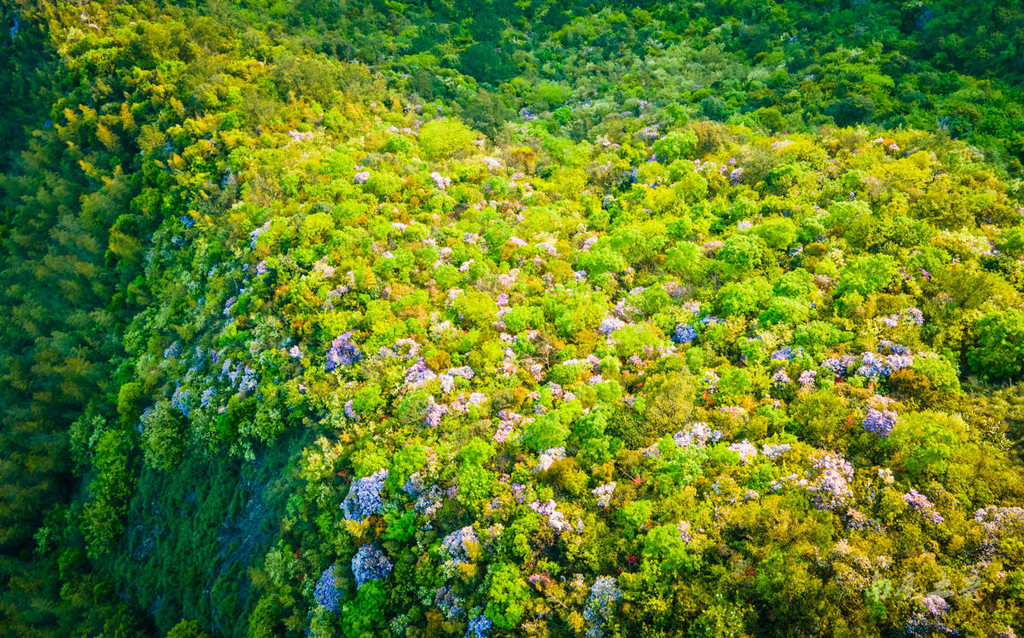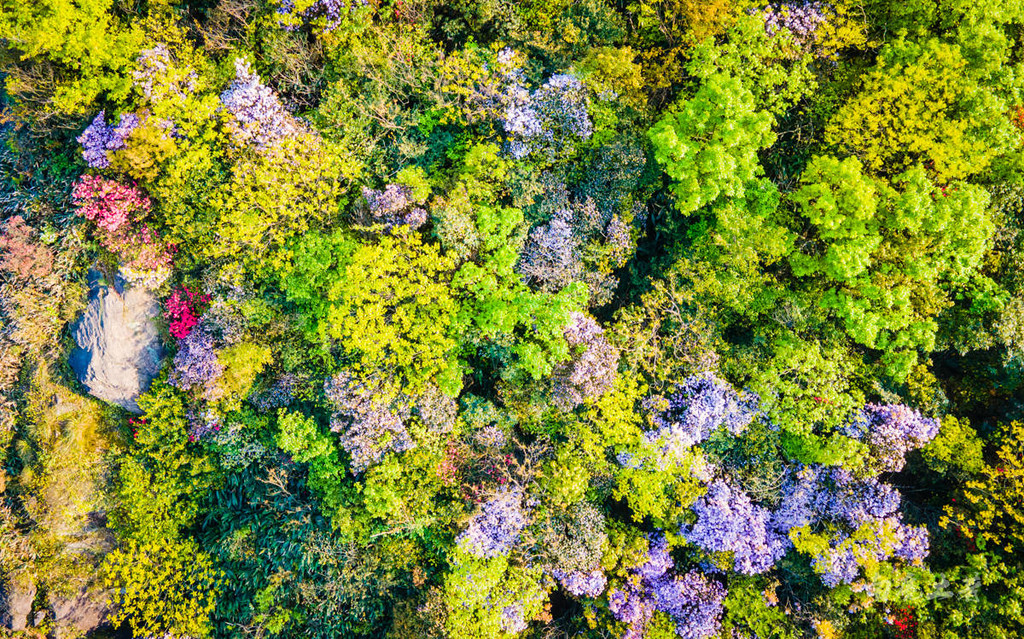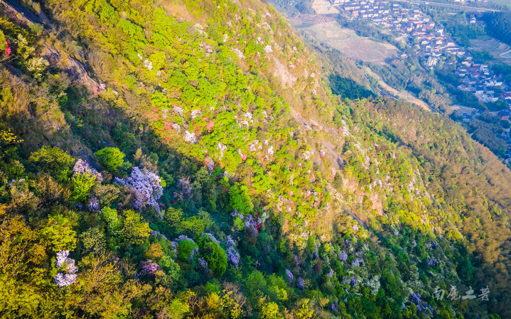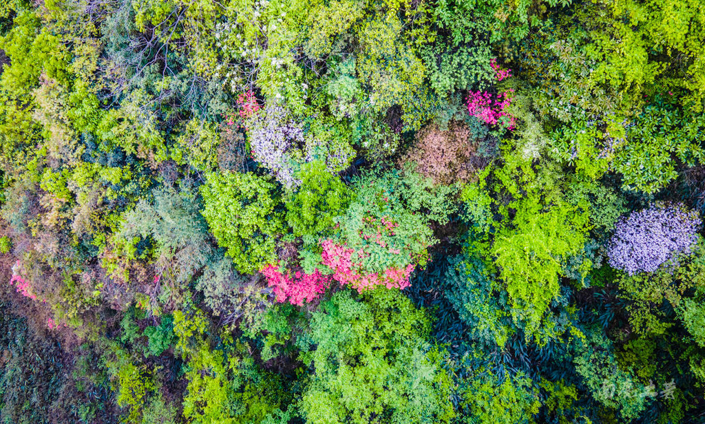 这里不像传说中的漫山红遍,陡峭的山坡上没有路,估计也无人涉足,各种颜色的杜鹃花朵恣意地盛开,映衬在茂密的绿树之间,俯瞰像春天的调色板。