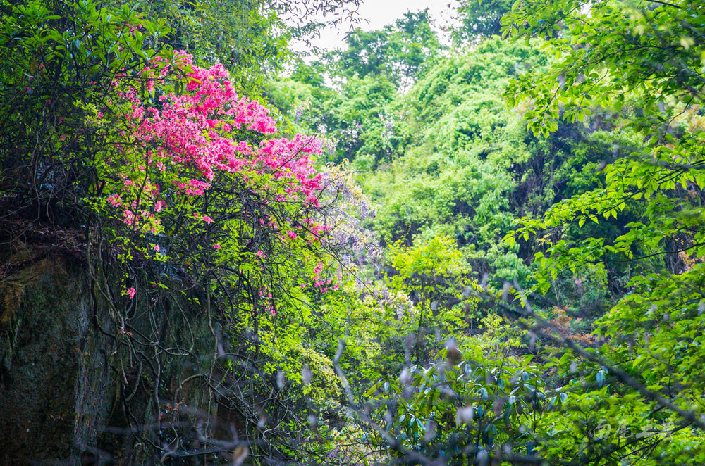 隔三差五的路段,绿林包围之中,会迎面一簇簇火红的杜鹃,在悬崖上伸出,给人以惊艳。