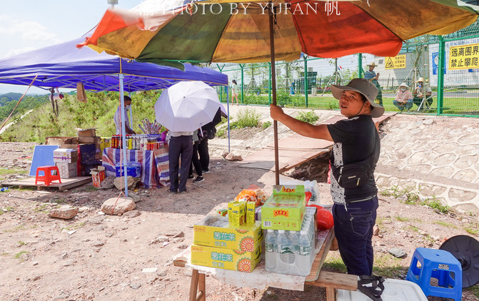 由于每天都有很多人前去看飞机,慢慢地边上已经开始形成一个小型市场,售卖小吃、饮料、瓜果、冰淇淋等,老板说今天太晒、太热了,来看飞机的人比较少。