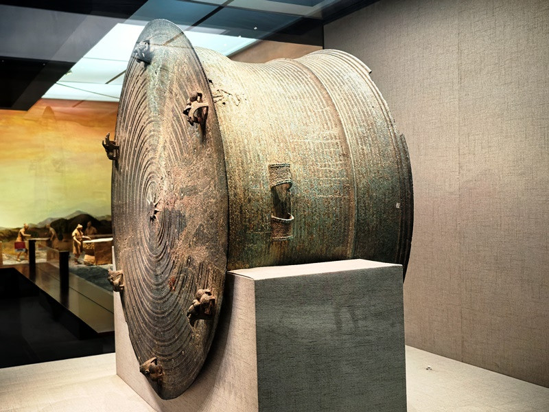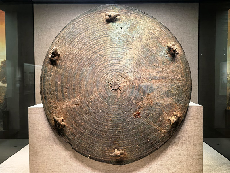 玉林市博物馆的镇馆文物,国家一级文物,南朝时期的虎饰四出钱文铜鼓,是迄今发现的世界上最大的灵山型铜鼓。
