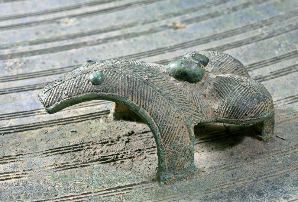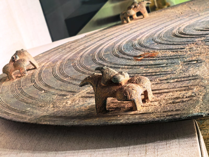 此铜鼓之所以称为虎饰四出钱文铜鼓是因为鼓上有虎,但鼓面上显著位置装饰的是蛙。蛙因产卵多,被很多少数民族视为生殖崇拜的图腾。铜鼓面上一般装饰的都是各种造型的蛙。而虎则在鼓脚上,也就说,虎在角落上,有点不起眼,不仔细看,很容易被忽略。