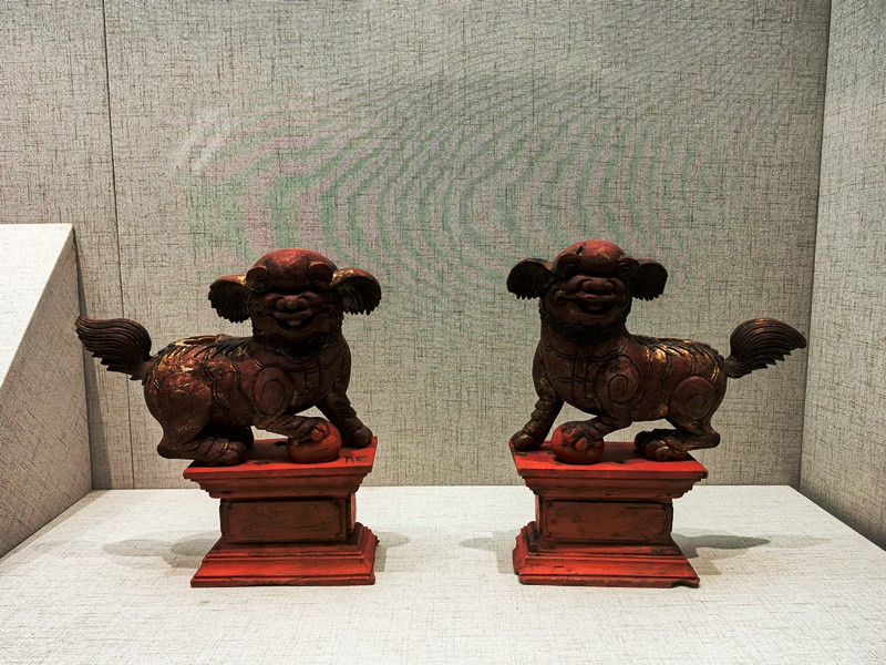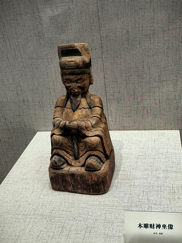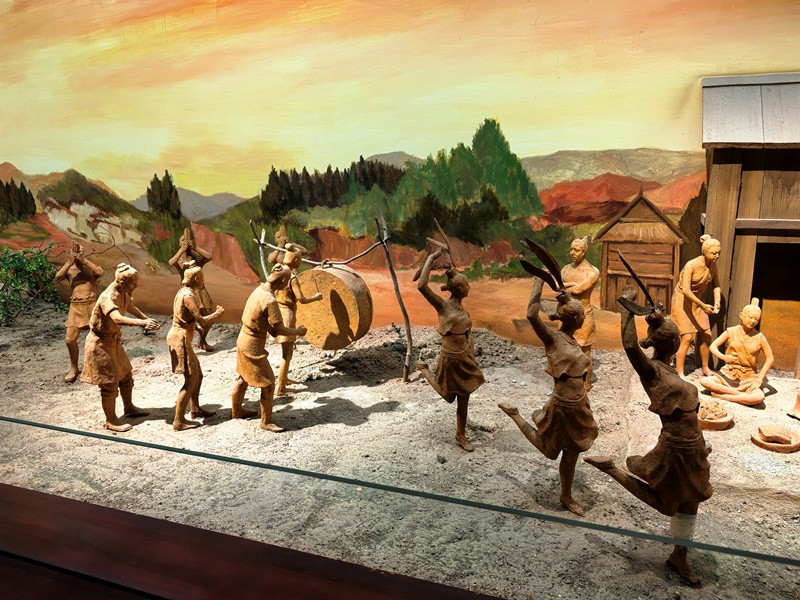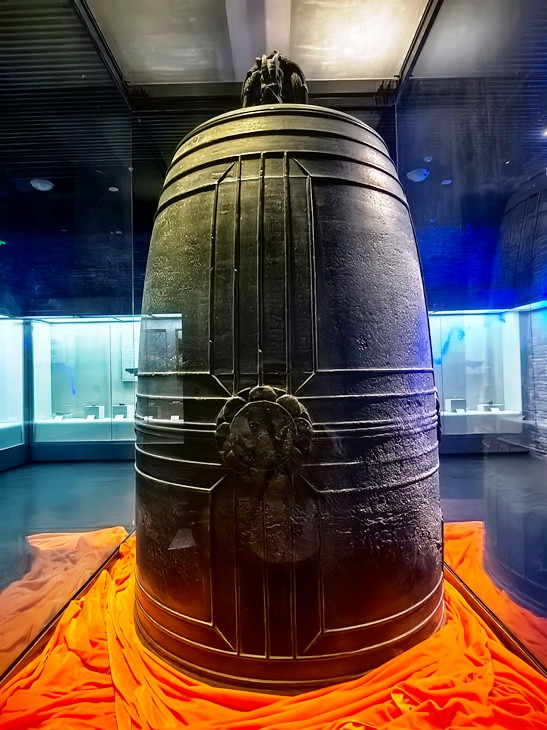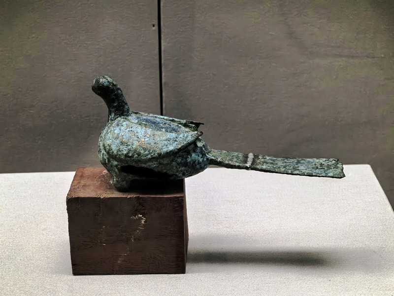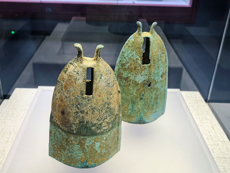 博物馆展示形制独特的、战国时期的羊角钮铜编钟和汉代鸠杖头。