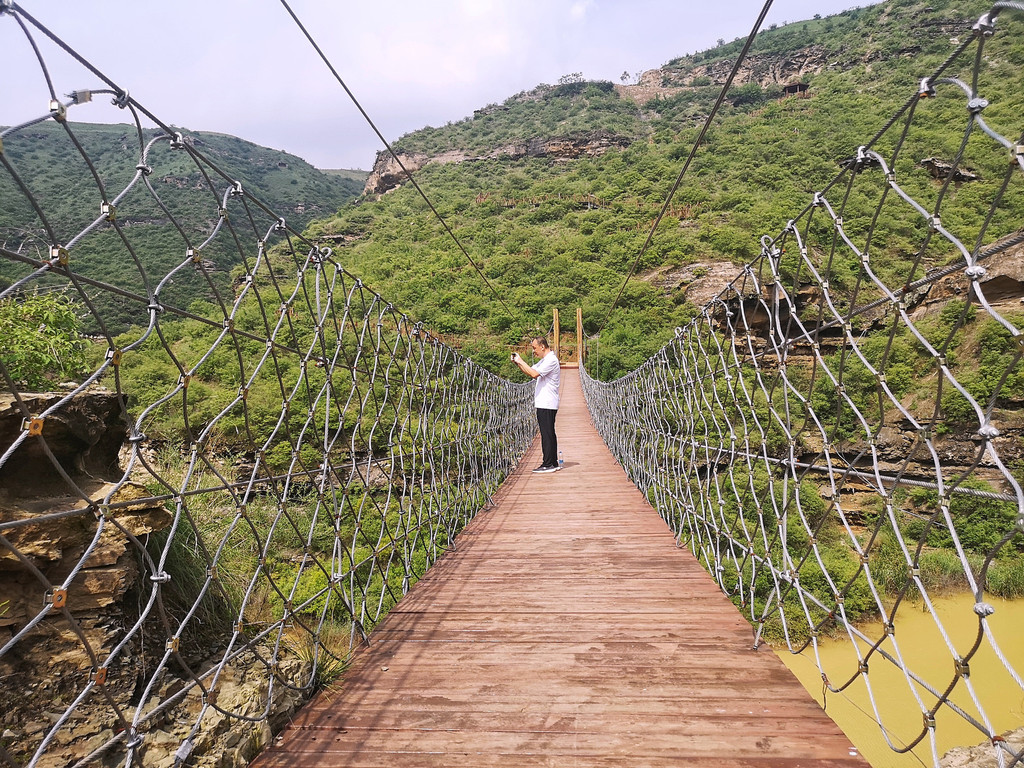 这里有着茂密的植被和一湾绿色的清水,让它看上去还有点儿苗寨的味道,但又不及苗寨人声喧闹。会峰寨与乾坤湾、清水关相傍相依,历经千百年,能够完整保留下来真是一种幸运,恍然间,我忘了我们是地处黄土高原上,感受到的却是幽静秀丽和险峻之美。回来时我们是从垂直距离600多米的云梯上爬到南侧入口处的。