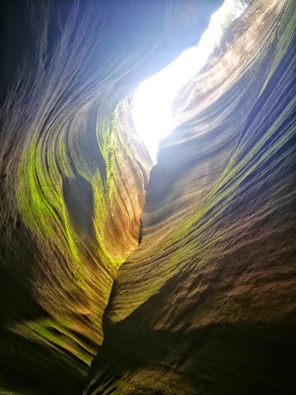 甘泉县雨岔大峡谷,属于原生态的峡谷,这样的峡谷在该地大大小小共有五处,桦树沟最美,龙巴沟最长。此地貌是由地震、水和风雕琢而出的奇特景观,峡壁凹凸有致,线条优美流畅,谷内宽窄不一,峡顶忽张怱合,淌水而行,崎岖不平,随着光线变化,不同的时间,不同的角度,不一样的美。最佳观赏时间为晴天中午12时至15时。