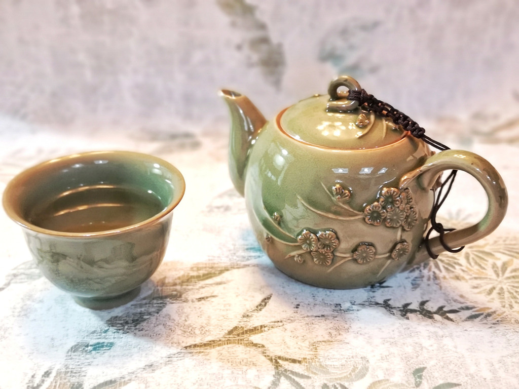 不过,上面这两张图片是我在2017年国庆期间去拍的,这次趁好友一家游览黄帝陵功夫,我们从铜川口下来,顺道去了趟耀州窑博物馆,最终我们赶往黄陵去集合。耀州窑是中国传统制瓷工艺中的珍品,宋代六大窑系之一。青瓷胎薄质坚,釉面光洁匀静,色泽青幽,呈半透明状,十分淡雅。据古书记载,在它最辉煌的时候,漆河两岸陶坊密集,史称“十里陶坊”,每当夜幕降临,炉火星星点点,彻夜不灭,成为一道壮丽的景观,“漆河不夜”也被誉为耀州七景之一。今天在L家窑坊展厅偶遇极具眼缘的青瓷茶壶一把、茶杯一对和凤鸣壶一枚,毫不犹豫就花了几百大洋将其收入囊中,哈哈~算是不枉此行!