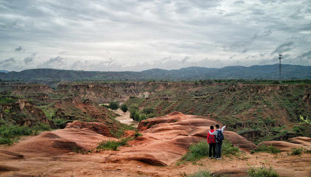出发10几分钟后,头顶的云团渐渐飘散,梦寐以求的晴天虽然未至,但随着气温的上升,公路两边的山圪崂的土由深棕色渐渐变红,我们内心一阵窃喜。30分钟后就到了龙洲乡镇,当地村民(向导)告诉我们,目前波浪谷1-2号景区正在施工(无法进入),景区下一步将实行规范管理,配备专用景区交通车,所有私家车不得私自进入,于今年国庆节正式对外开放。目前要去的话,只能游览3-5号区域(比1和2号规模稍微小一些),由于刚下过雨,路况不佳,建议搭乘他们的小面包车,当然是有偿的(每家100元)。虽然来之前问过朋友,说波浪谷为全天免费开放景区,但我们还是决定跟着当地人去游,既省时又省力,避免意外。于是停车,做好防晒、带上补给和雨伞雨衣,上了当地向导的小面包车,一行6人一辆车刚刚好。