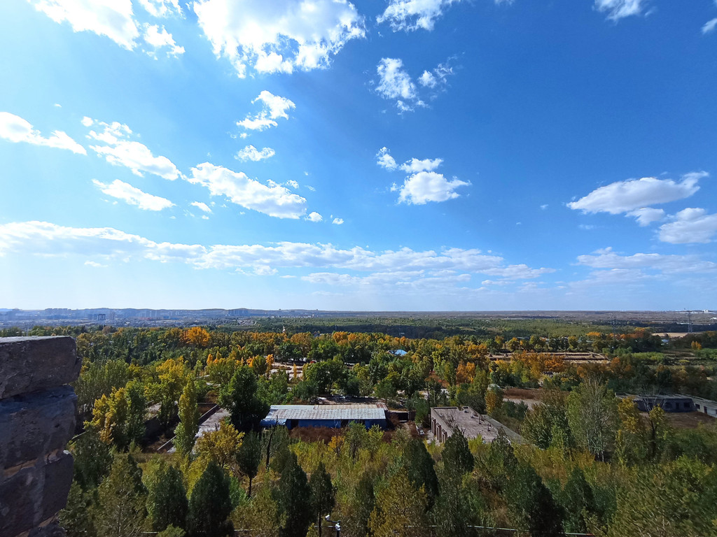 终点站直接下车走几步就到了景点了,可能是过了国庆旅游周了,景区游客不是很多,三三两两的。景区里面不少是新建的,卫城里面尚有一些遗存,站在城墙上,极目四望,可以看到广阔的黄土高原景观,往北就是蒙古高原了,早年的三北防护林建设,再加上近几年对于北方植被保护的重视,生态环境看起来还是不错的。蓝天白云绿树相映成画,好一幅塞外秋景。景区里面的长廊对于明朝的九边有比较详尽的介绍,还是长了不少知识的。之前走过了山海关,也去了嘉峪关,这次能来到旧时延绥镇镇北台也算是一种圆满吧。卫城里的老榆树,枝繁叶茂,撑开的城墙一角,隐藏了多少岁月的沧桑。