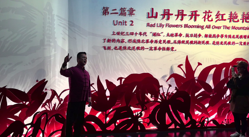 展览陕北民歌的发展历程、形式分类、典型曲目,在民歌不同表现形式的展区,有歌手为观众演唱典型曲目。