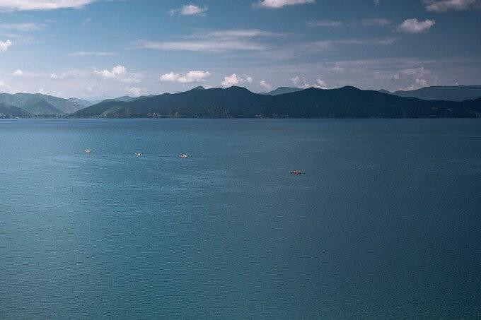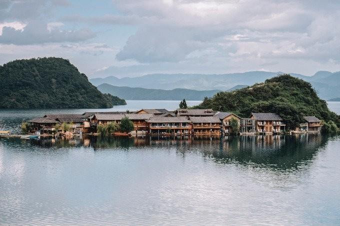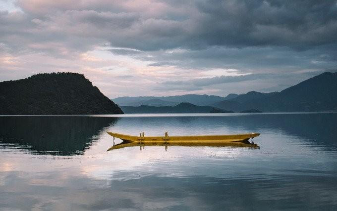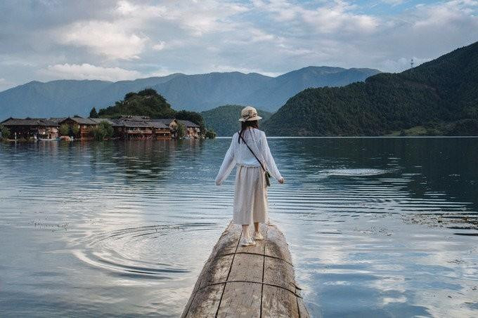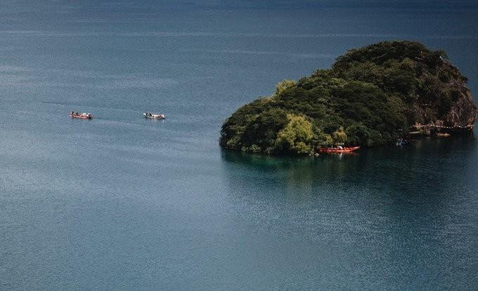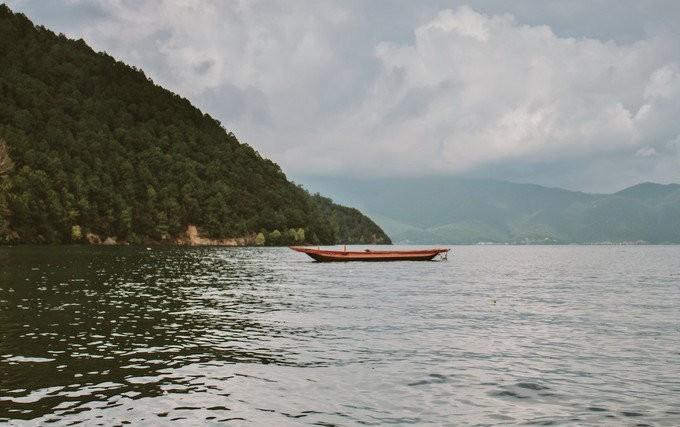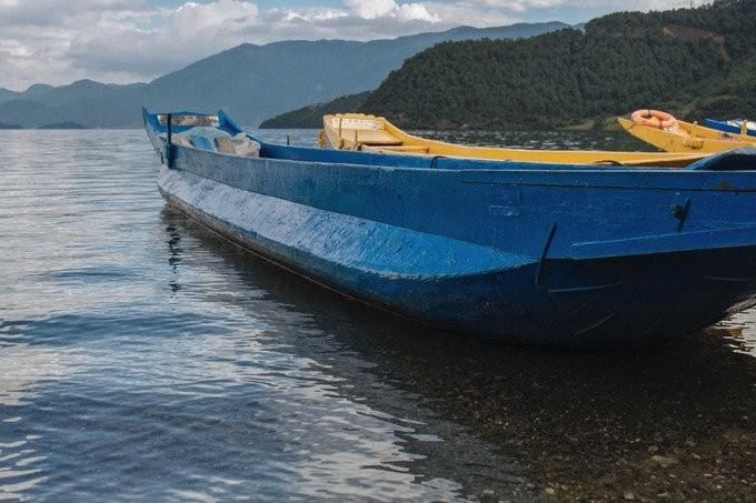 从观景台上下山,往里格岛走,一路上湖边有很多供人拍照的小船,大多数是客栈所有,需要收10块的费用,不过我们找到一个不需要交钱的废旧木船。