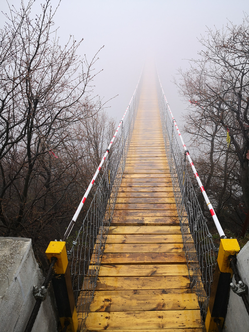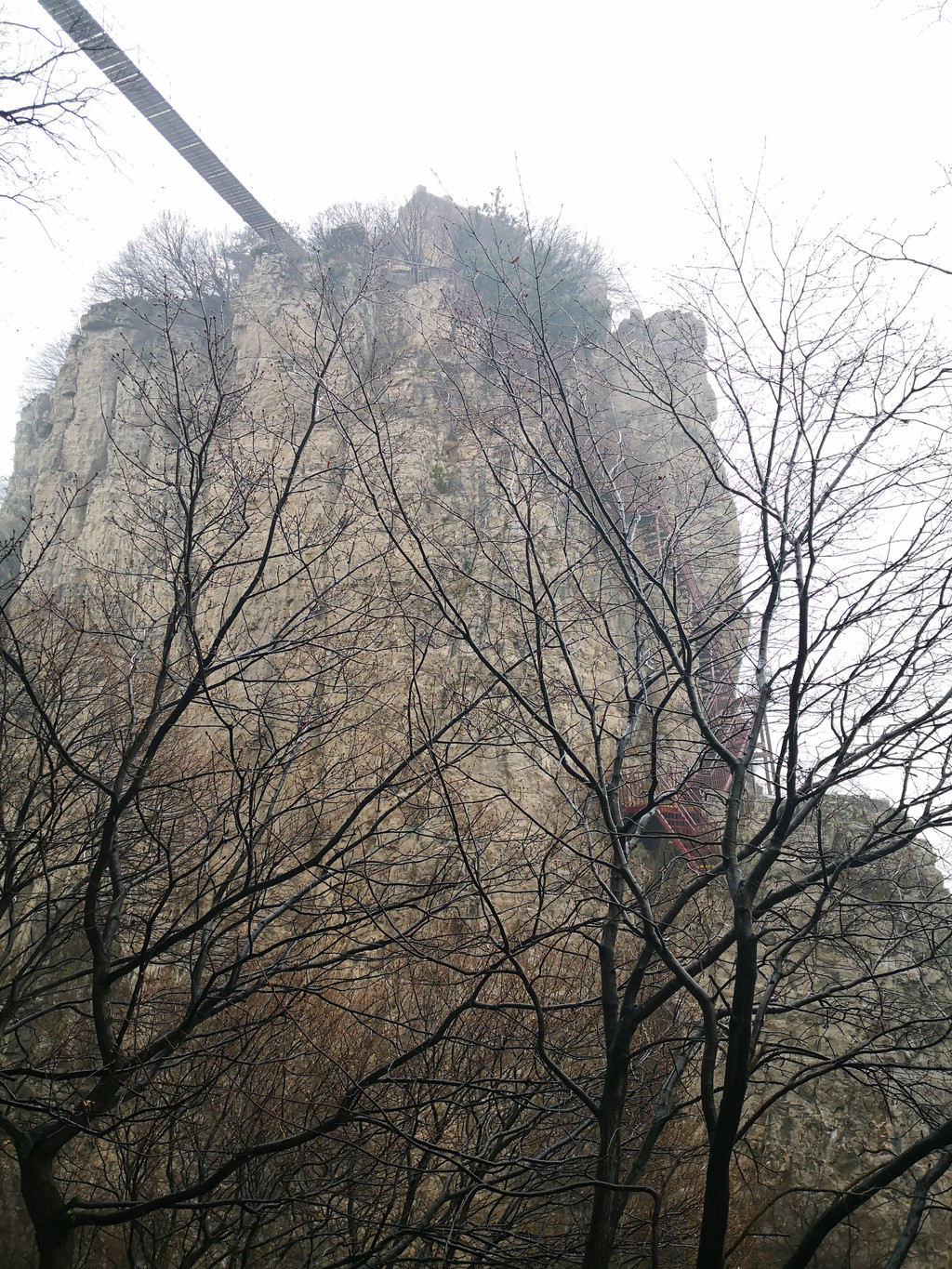 登顶玉柱峰时,有两条岔路,景区的官方提示是走右侧的路线。其实,如果游人很少的情况下,两侧的路线均可登顶,左侧上去是石阶路,然后需要走一条长长的拉索天桥,到达峰顶;右侧则是直接攀爬陡峭的原始石阶和铁制悬梯登顶。我们登顶时,恰逢天气是大雾甚至有些毛毛雨,道路非常湿滑,所以路上碰上几批游客都担心安全问题而放弃了登顶。我们的经验是,右侧登顶线路在雨天湿滑的状态下,确实危险系数较高,前半段石阶是不规则而光滑的天然岩石,需要手脚并用,后半段是镂空的天梯,对于我这样的恐高症患者着实不够友好。这段路上山还可以,雨天下山危险系数太高,一定要规避。从左侧登顶难度系数要小很多,石阶是新修的非常规整,只是天桥是拉索软桥,而且距离比较长,下面就是万丈深渊,胆小的可能也会有点打怵。我们下山走的是这条路,天桥通向浓雾中看不到尽头,不自觉就蹦出云深不知处的念头。由于是在峡谷中,走到一半会明显感觉到凌冽的山风,走上去整个拉索桥也会有明显晃动,我这个小心脏啊那叫一个突突,两只手死死抓住两侧的铁索,愣是没顾上在桥中间拍个照。