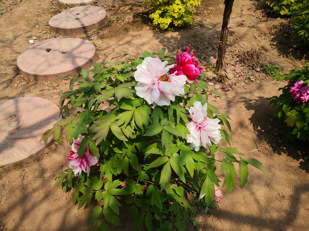 走到这里,古建筑也就参观完毕了,继续往前走还有很大园区,但都是现代修建的景观了,没什么可看的,不过这个时节恰逢里面有一大片牡丹花盛开,倒也是一景,其中一株牡丹上开出三种花色,着实惊艳。