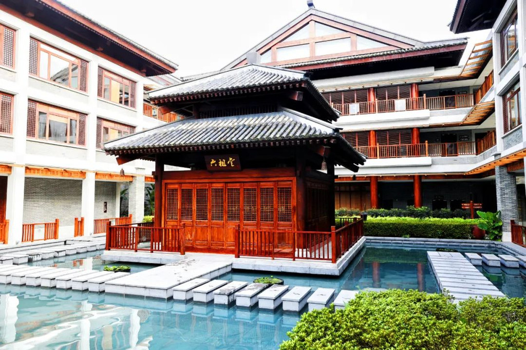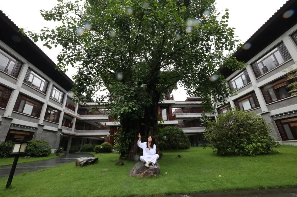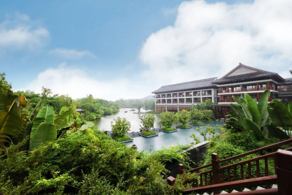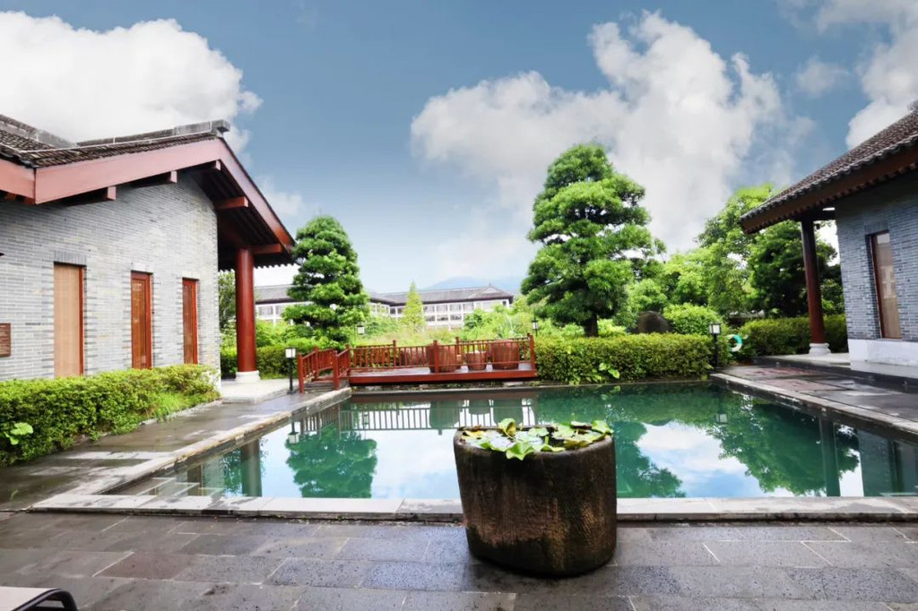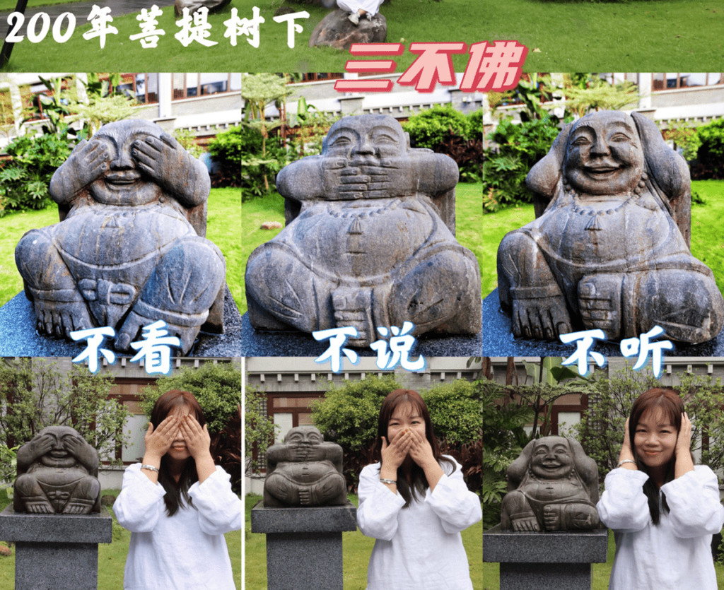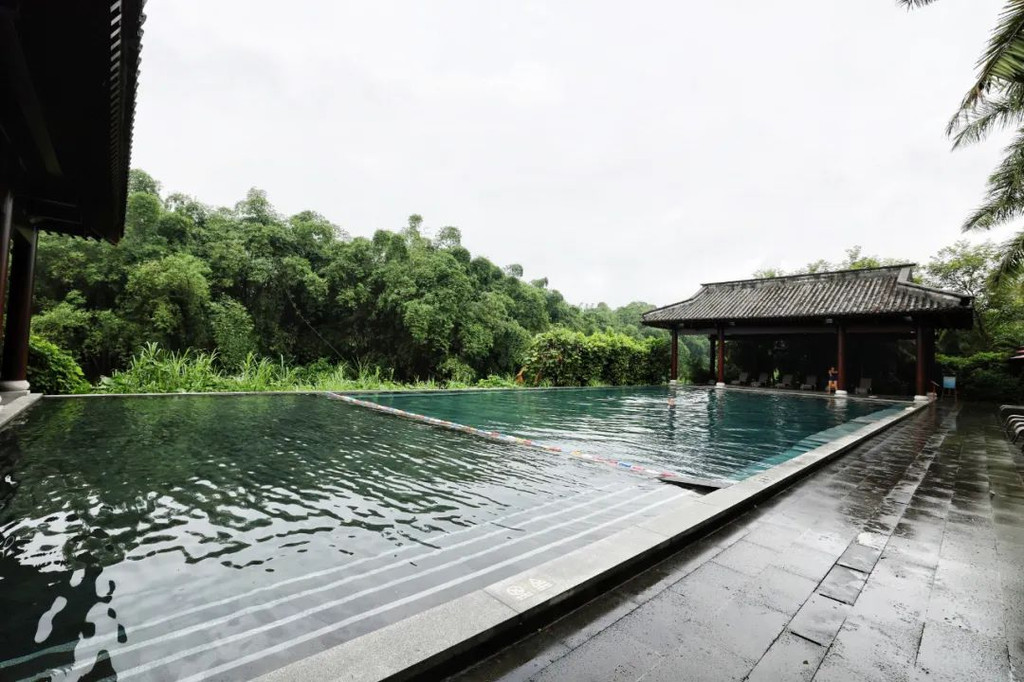 在抄写前需净手、擦拭、熏香,以示庄重。抄写过程中须禁语,所有动作需放轻放缓,抄写经书就是修行的过程,也是一种功德。抄写完成后,经书还可以收藏或供奉到六祖像前,都是功德无量、大吉大利的。我抄了一个小时了!很用心哦!【禅乐坊】再去【禅乐坊】,禅乐色空。面前这个是叫色空鼓,网上卖还挺贵的哦,敲击时会发出柔和的声音,当然我们弹会有点杂乱,不过老师弹就很好听,听起来很舒服。我用色空鼓演绎了一曲《沧海一声笑》,有谱子,按着数字敲就好!【禅坐参悟】坐禅是参悟禅道的法门,也是一种养生保健的好方法,我也是第一次在这样的环境坐一个小时的,有什么感觉呢,就是把心静下来,远离手机,远离喧嚣,真真正正感受到身心的平静。【听茶说话】来到【禅心斋】,有老师给我们介绍很多关于禅茶的知识。听茶说话,品茶,泡茶,观茶,入茶,德云水禅之妙,品一杯禅茶,听一首禅曲,细品人生苦尽甘来!在酒店的水帘大堂附近,每周二四都会有老师教大家打太极,禅武太极是好东西,珊珊也试试在平静的游泳池边舒展筋骨,直接进入人类养生的最高境界!【禅文化打卡点】除了禅文化的活动以外,酒店里还有酒店里有很多很有意思的禪文化的打卡点。【两百年的菩提树】“菩提”一词为古印度语(即梵文)Bodhi的音译,意思是觉悟、智慧,用以指人如梦初醒,豁然开朗,顿悟真理,达到超凡脱俗的境界。佛祖既然是在此树下“成道”,此树便被称为菩提树。在菩提树下打坐,也是很有意境的哦。而酒店这颗菩提树是从印度深山老林中移植,树龄有200多年了。到了晚上19:30,酒店里还有放莲心灯的活动,在树下拿着莲心灯往六祖堂放下心灯祈福许愿呢。【三不佛】就在菩提树旁边,有着三尊【三不佛】。“三不”是指“不看不听不说”,不当看的不看,不当听的不听,不当说的不说,寓意佛家所倡导的“闭目,掩耳,噤声”的思想。我感觉来这样一组照片,可以做一套朋友圈头图和表情包呢。【山水石景】在菩提树正对面,有一套山水石景,此山水石景来历不凡,所见的假山石头是广西红水河特有的摩尔石,摩尔石形状奇特而优美,色泽温润柔和,广受各路收藏家追捧,被过度挖掘,因形成难度大目前已基本绝迹。假山上种植的是日本黑松,针叶浓绿,四季常青,树姿古雅,可终年欣赏。在前台接待后方布置山水石景既是丰富景观也有传统风水讲究的“背有靠山”之意。我在酒店这几天来来回回走了几次,发现在夕阳的时候,光影会在屋檐边晒过来,真的很好看。【水晶石】就在菩提园的另一边,有一块超级大的水晶石,此水晶王产自巴西,长157cm,宽136cm,高145cm,重约3.3吨。二氧化硅(SiO2)含量高达99.99%,据说,这是穿越时空的产物,这至少需要25亿年以上的稳定地质条件方可形成,属于水晶中的极品。晶体柱面有横纹,外观宛如大钻石,在阳光照耀下,晶体晶莹剔透,晶面熠熠闪光,犹如神玉,实属旷世奇石,被誉为“水晶王”。白水晶所具有的能量磁场,还能使人头脑清明、精神爽直,令人思维敏捷、增强自信、精力充沛、延年益寿。靠在上面很舒服哦。【六祖堂】六祖堂是禅修专享项目“传灯发愿”的场所。这地方拍雨景很好看,如果用慢速拍摄的话,居然感受到有一种大雪纷纷的美感。【温泉会所】游玩菩提园可以玩一天,然后温泉会所也是可以玩一天的,就在酒店的旁边,来到了亲水平台。位于禅堂后方的亲水平台,是观景纳凉的好去处。然后通过禅道,就走到了龙山湖。【龙山湖】