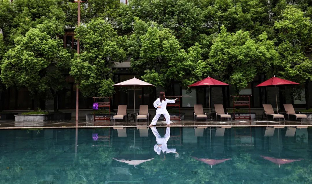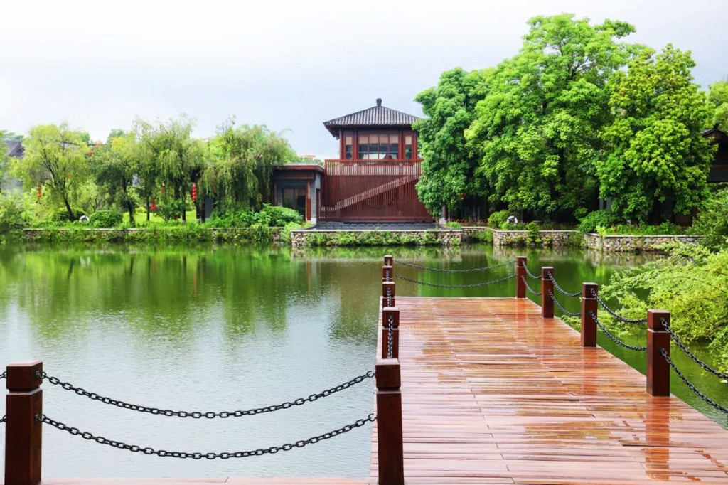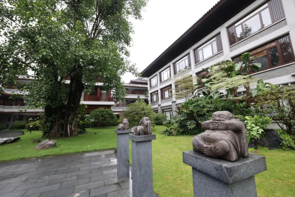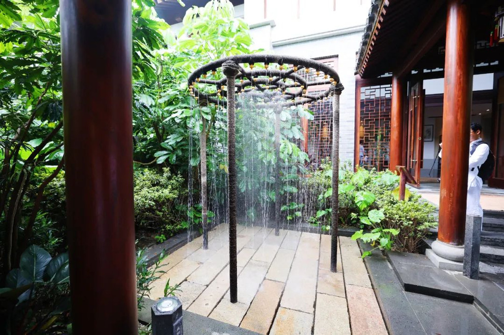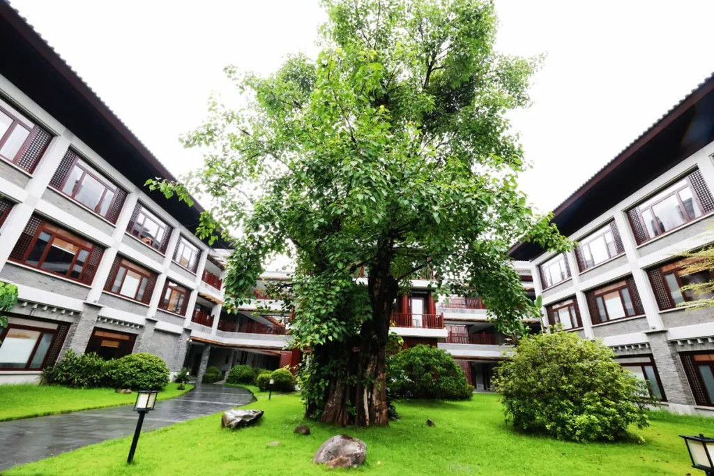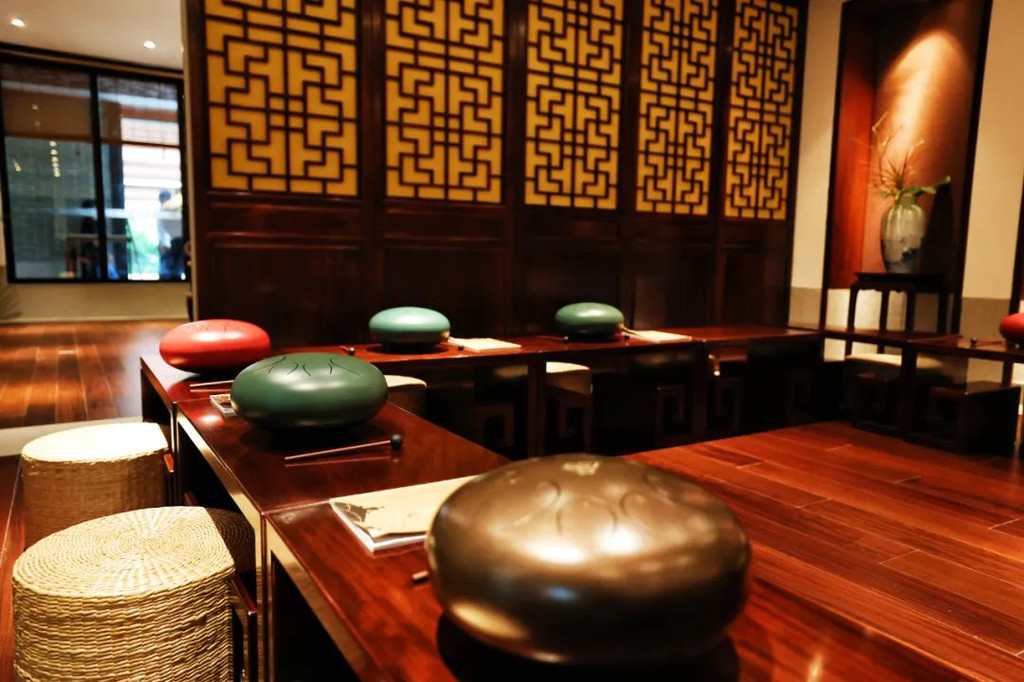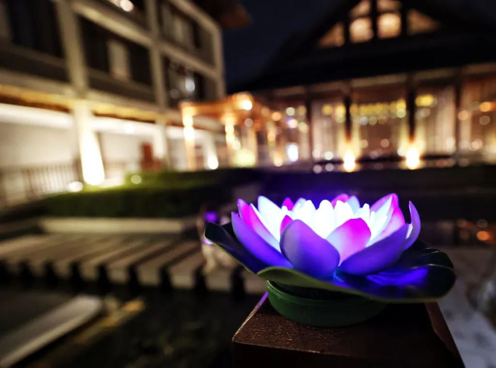 在抄写前需净手、擦拭、熏香,以示庄重。抄写过程中须禁语,所有动作需放轻放缓,抄写经书就是修行的过程,也是一种功德。抄写完成后,经书还可以收藏或供奉到六祖像前,都是功德无量、大吉大利的。我抄了一个小时了!很用心哦!【禅乐坊】再去【禅乐坊】,禅乐色空。面前这个是叫色空鼓,网上卖还挺贵的哦,敲击时会发出柔和的声音,当然我们弹会有点杂乱,不过老师弹就很好听,听起来很舒服。我用色空鼓演绎了一曲《沧海一声笑》,有谱子,按着数字敲就好!【禅坐参悟】坐禅是参悟禅道的法门,也是一种养生保健的好方法,我也是第一次在这样的环境坐一个小时的,有什么感觉呢,就是把心静下来,远离手机,远离喧嚣,真真正正感受到身心的平静。【听茶说话】来到【禅心斋】,有老师给我们介绍很多关于禅茶的知识。听茶说话,品茶,泡茶,观茶,入茶,德云水禅之妙,品一杯禅茶,听一首禅曲,细品人生苦尽甘来!在酒店的水帘大堂附近,每周二四都会有老师教大家打太极,禅武太极是好东西,珊珊也试试在平静的游泳池边舒展筋骨,直接进入人类养生的最高境界!【禅文化打卡点】除了禅文化的活动以外,酒店里还有酒店里有很多很有意思的禪文化的打卡点。【两百年的菩提树】“菩提”一词为古印度语(即梵文)Bodhi的音译,意思是觉悟、智慧,用以指人如梦初醒,豁然开朗,顿悟真理,达到超凡脱俗的境界。佛祖既然是在此树下“成道”,此树便被称为菩提树。在菩提树下打坐,也是很有意境的哦。而酒店这颗菩提树是从印度深山老林中移植,树龄有200多年了。到了晚上19:30,酒店里还有放莲心灯的活动,在树下拿着莲心灯往六祖堂放下心灯祈福许愿呢。【三不佛】就在菩提树旁边,有着三尊【三不佛】。“三不”是指“不看不听不说”,不当看的不看,不当听的不听,不当说的不说,寓意佛家所倡导的“闭目,掩耳,噤声”的思想。我感觉来这样一组照片,可以做一套朋友圈头图和表情包呢。【山水石景】在菩提树正对面,有一套山水石景,此山水石景来历不凡,所见的假山石头是广西红水河特有的摩尔石,摩尔石形状奇特而优美,色泽温润柔和,广受各路收藏家追捧,被过度挖掘,因形成难度大目前已基本绝迹。假山上种植的是日本黑松,针叶浓绿,四季常青,树姿古雅,可终年欣赏。在前台接待后方布置山水石景既是丰富景观也有传统风水讲究的“背有靠山”之意。我在酒店这几天来来回回走了几次,发现在夕阳的时候,光影会在屋檐边晒过来,真的很好看。【水晶石】就在菩提园的另一边,有一块超级大的水晶石,此水晶王产自巴西,长157cm,宽136cm,高145cm,重约3.3吨。二氧化硅(SiO2)含量高达99.99%,据说,这是穿越时空的产物,这至少需要25亿年以上的稳定地质条件方可形成,属于水晶中的极品。晶体柱面有横纹,外观宛如大钻石,在阳光照耀下,晶体晶莹剔透,晶面熠熠闪光,犹如神玉,实属旷世奇石,被誉为“水晶王”。白水晶所具有的能量磁场,还能使人头脑清明、精神爽直,令人思维敏捷、增强自信、精力充沛、延年益寿。靠在上面很舒服哦。【六祖堂】六祖堂是禅修专享项目“传灯发愿”的场所。这地方拍雨景很好看,如果用慢速拍摄的话,居然感受到有一种大雪纷纷的美感。【温泉会所】游玩菩提园可以玩一天,然后温泉会所也是可以玩一天的,就在酒店的旁边,来到了亲水平台。位于禅堂后方的亲水平台,是观景纳凉的好去处。然后通过禅道,就走到了龙山湖。【龙山湖】