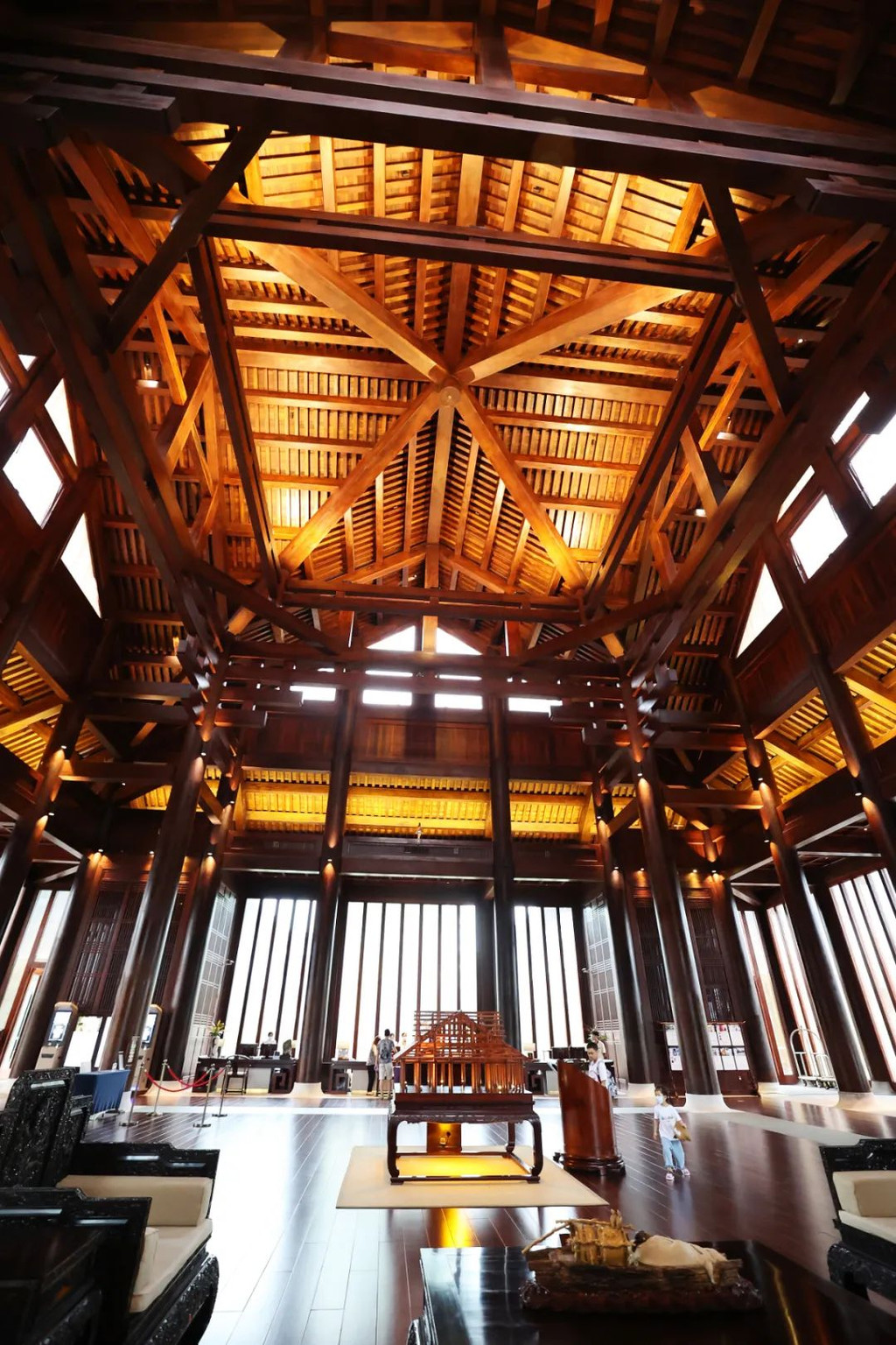 广州开车两个小时就来到了云浮新兴的【禅泉度假酒店】,走近大门口就感受到那股仙气飘飘的感觉,它是南中国首家以“禅文化”为主题的温泉度假型酒店,毗邻国恩寺,整个酒店占地12万平方米即200多亩,建筑面积8万多平方米。【大堂】总有人说,一个酒店好不好,看大堂就知道,坦白说,这是我去过zui壕气的大堂了,又高又大,大堂占地1000㎡,全实木结构,恢弘大气,气势磅礴!整体采用 “直上直下”的建筑风格和中国传统的榫卯结构,整个大堂的木结构全部是利用榫卯的凹凸结合连接起来,没有用一颗钉子!大堂摆放有建筑结构的缩小版模型,整个大堂由52根全原木柱子支撑,全部木材都是从非洲进口的柚木,木材从非洲的原始森林里通过大象运下山,漂洋过海到中国。最高的柱子达18.8米,目前世界上应用于建筑的柱子最长是19米,相差仅0.2米。原来这里是有典故的,酒店的柱子高度本可以达到19米,但19米超过了国恩寺的高度,为表达对六祖惠能大师的敬意而选择18.8米。横梁最大跨度达14米,国内独一无二,暂时还没有超过14米的木横梁跨度,技术十分精湛。这个大堂设计真的很有智慧,采光都很有智慧,每天早上9点半的时候,在酒店大堂里会有一道侧光,仿佛佛光一样射在大堂里,会拍照的亲们千万不要错过这道奇幻无边的自然光哦。看看正在表演的瑜伽老师,就能感受到这道阳光的美感。除了瑜伽表演,大堂还会不定期的有古筝表演,很赞哦。