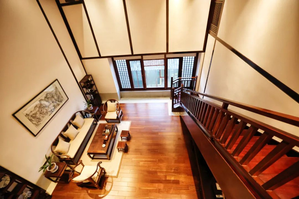另外酒店里还有一个很特别的禅房,复式的结构,楼下是会客厅。房间在夹层,全套老挝大红酸枝红木明式家具,还有一些名画,古董装饰,格调很高雅。