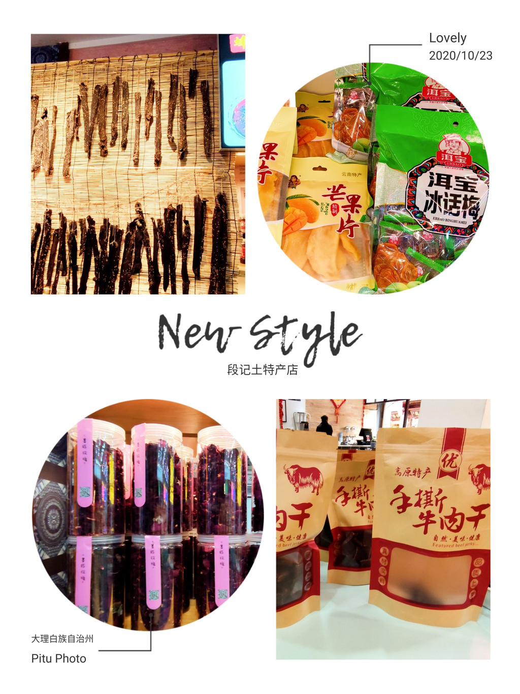 逛累了,在街边的一家小吃店,一人点了一份凉鸡米线。这家店的凉鸡米线我挺喜欢的,米线口感很劲道,冰凉爽滑,鸡丝很柔软,酱汁酸甜可口,特别棒!离开之前,还去了段记土特产店买了很多的土特产。这家店有香飘四溢的诺邓火腿、酸甜可口的雕梅、花香沁心的果酒和花果茶、极具云南特色的云南十八怪果脯拼盘等,都很好吃。真想把整个店都搬走~~