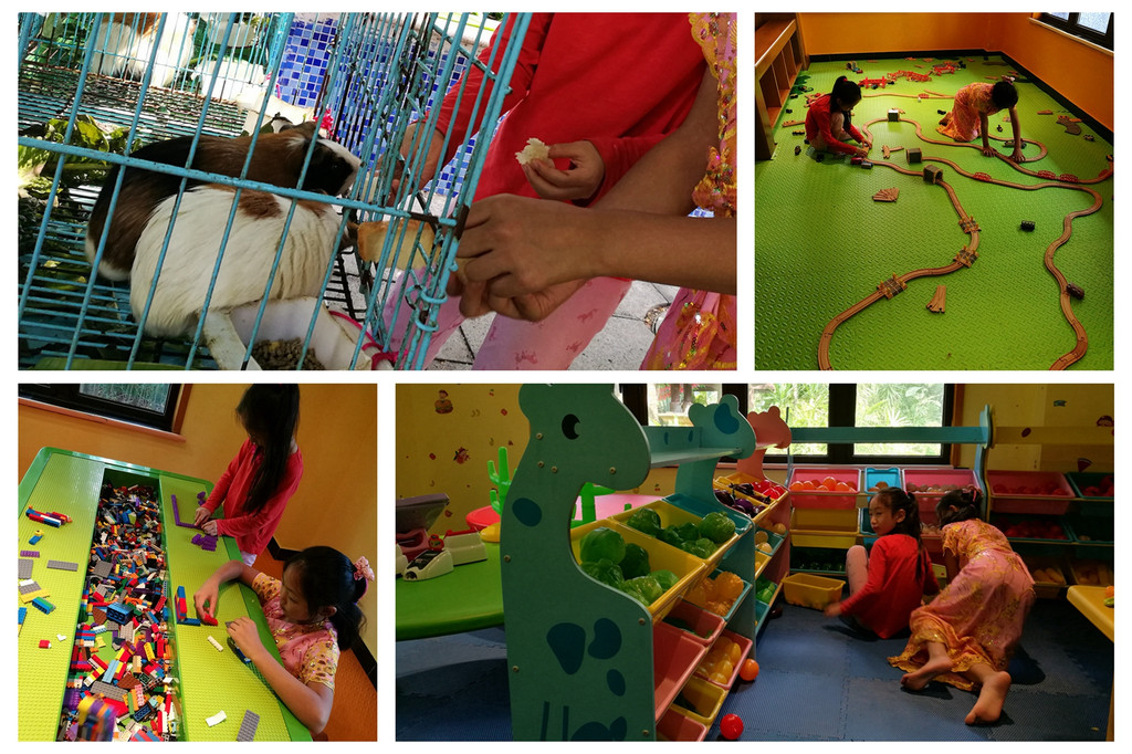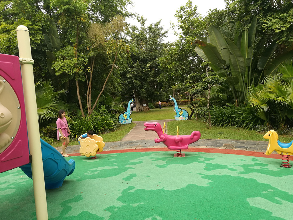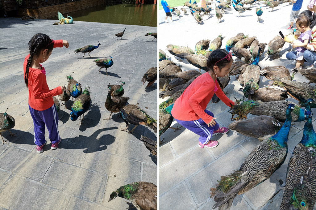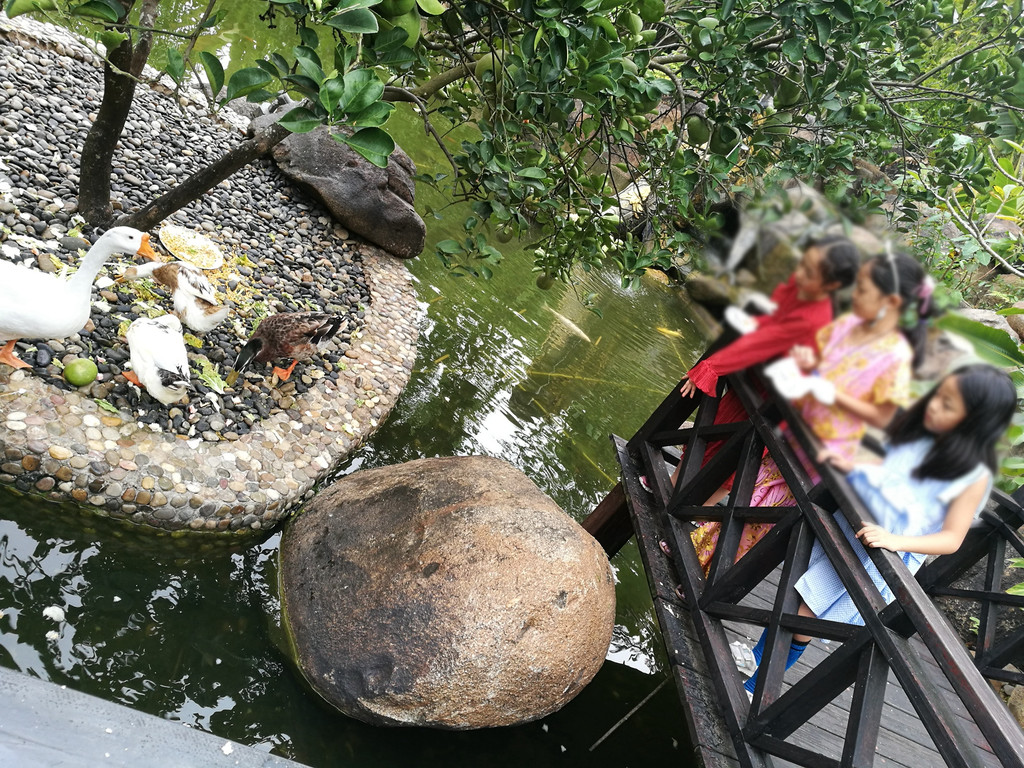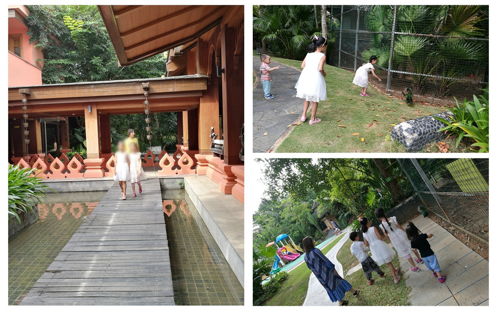 不像北方的酒店,小气的只是观赏,禁止投喂。这里的池塘边上,不仅不限制孩子喂鱼,还主动的提供塑料盒,让孩子把吃剩下的早餐面包、蛋糕之类的收拢起来,便于喂食。