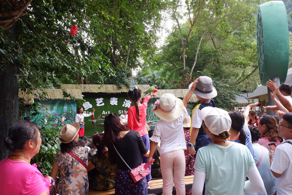 鹦鹉表演,叼取游客手中的人民币,实在是赚钱的便捷途径。