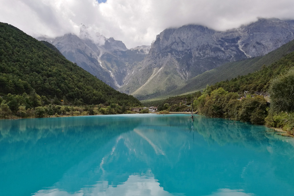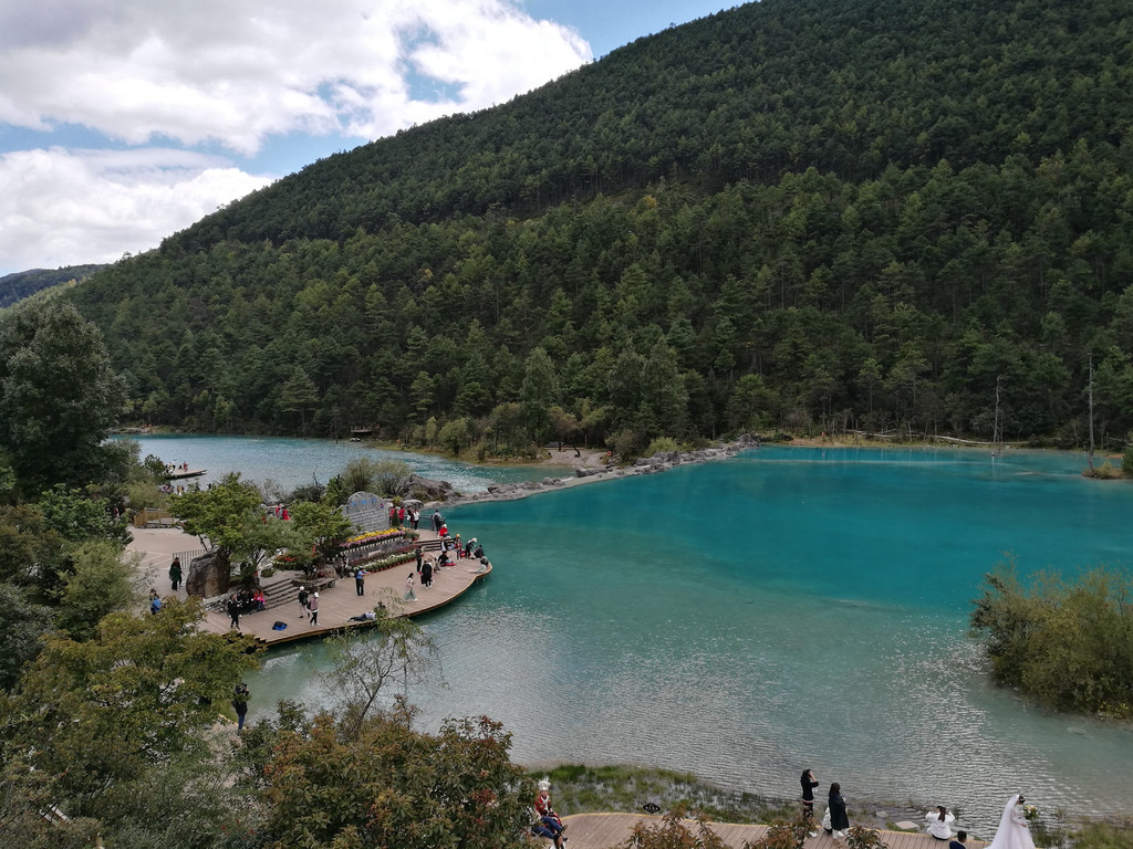 蓝月谷:玉龙雪山冰雪融化成河水从雪山东麓的一条山谷而过,因月亮在蓝天的映衬下倒影在蓝色的湖水中,又因英国作家希尔顿笔下的《消失的地平线》中的蓝月亮山谷近似于此。故名“蓝月谷”。蓝月谷中的河水在流淌过程中因受山体阻挡,形成了4个较大的水面,人称玉液湖、镜潭湖、蓝月湖和听涛湖。湖岸四周植被繁茂,远处雪峰背衬。
