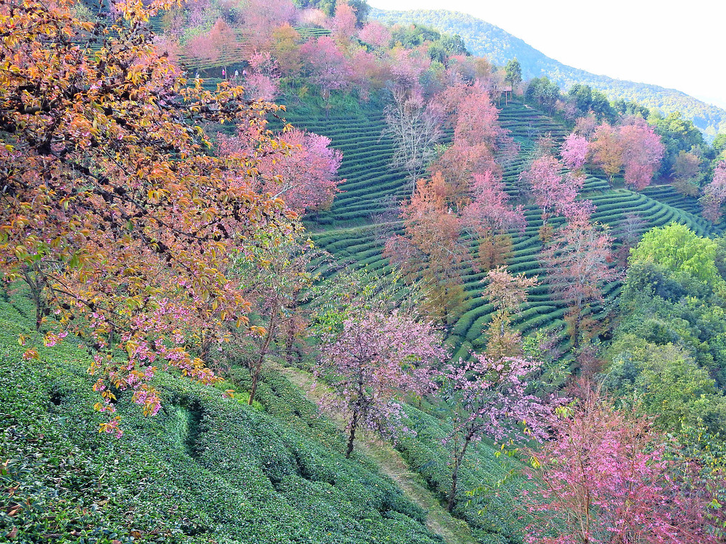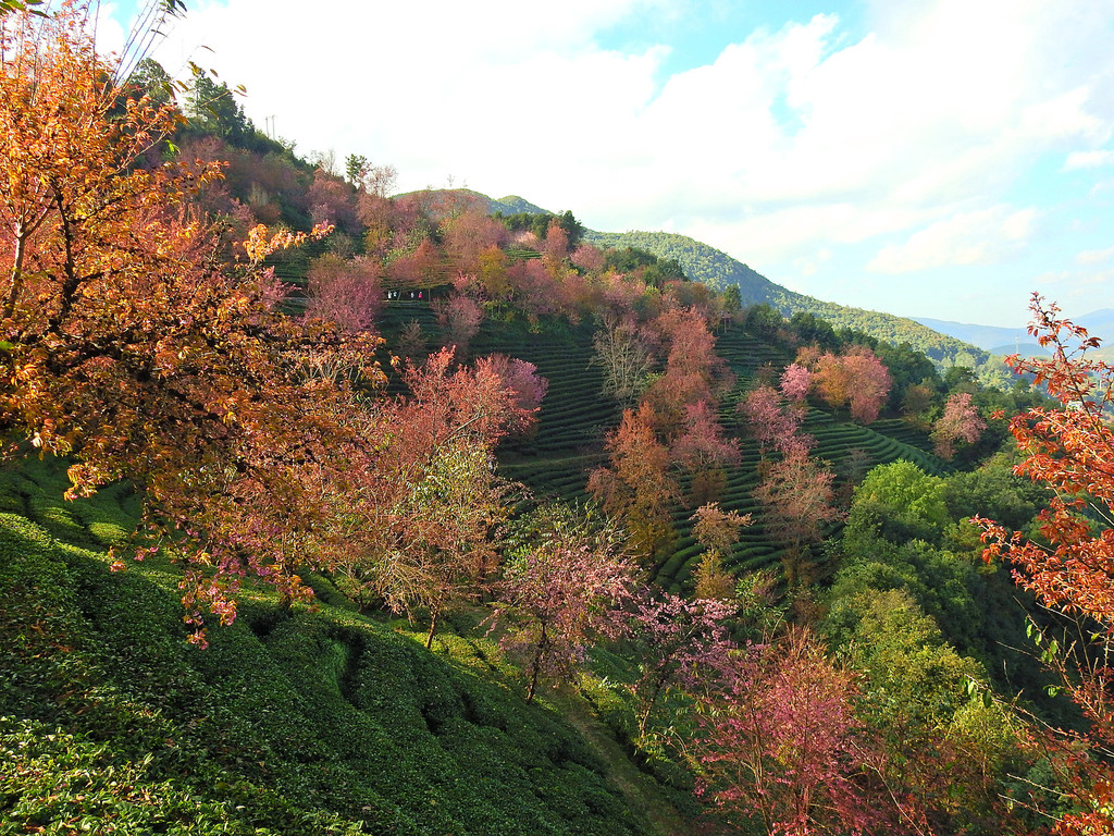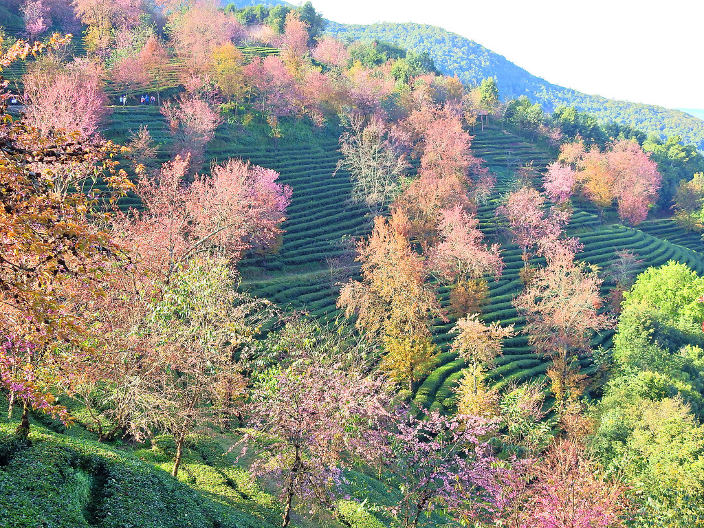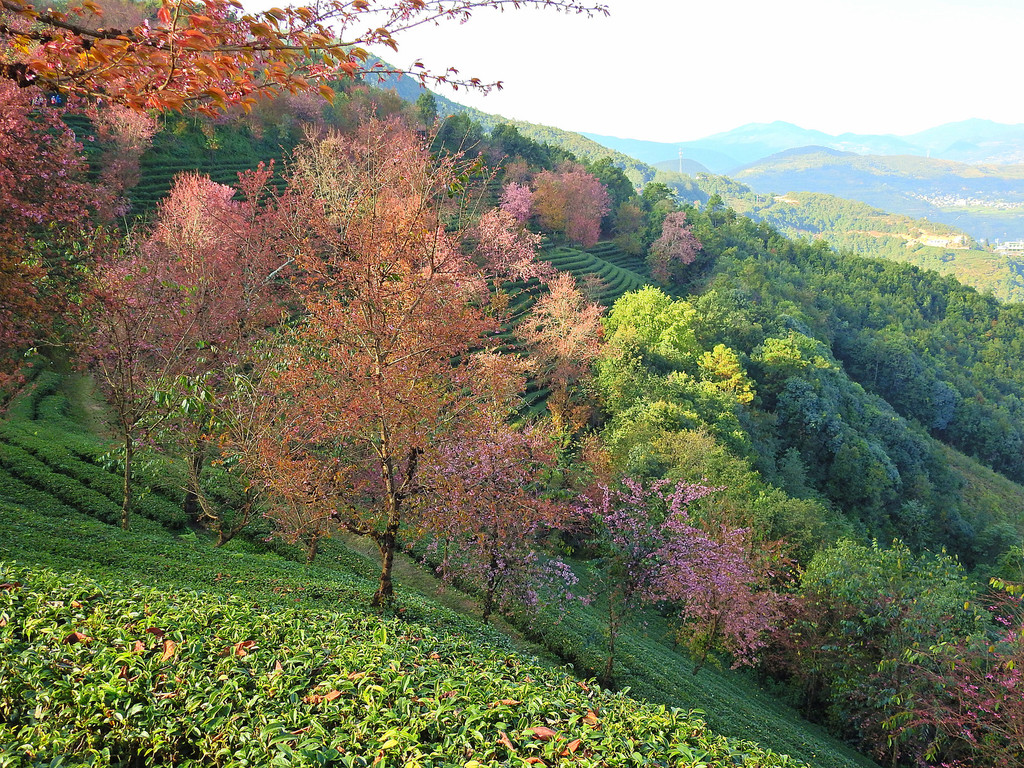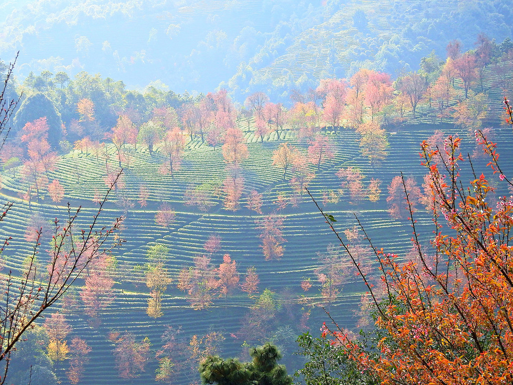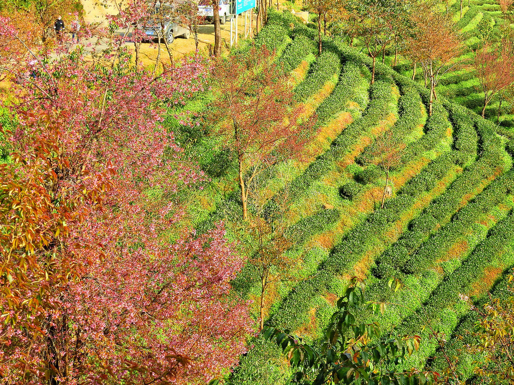 在无量山千亩茶园中,遍地冬樱开放,绚丽非凡,让整个山谷俨然一副油画。碧波荡漾的翠绿衬托着彩霞般的樱花,一派春天景象。