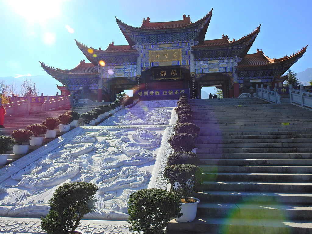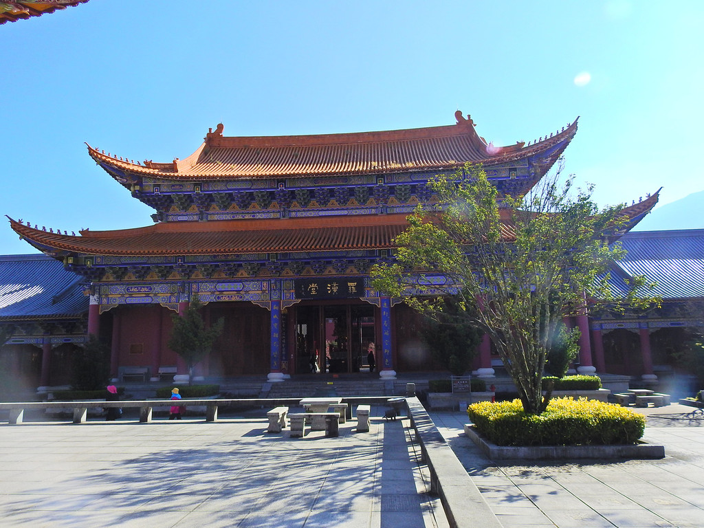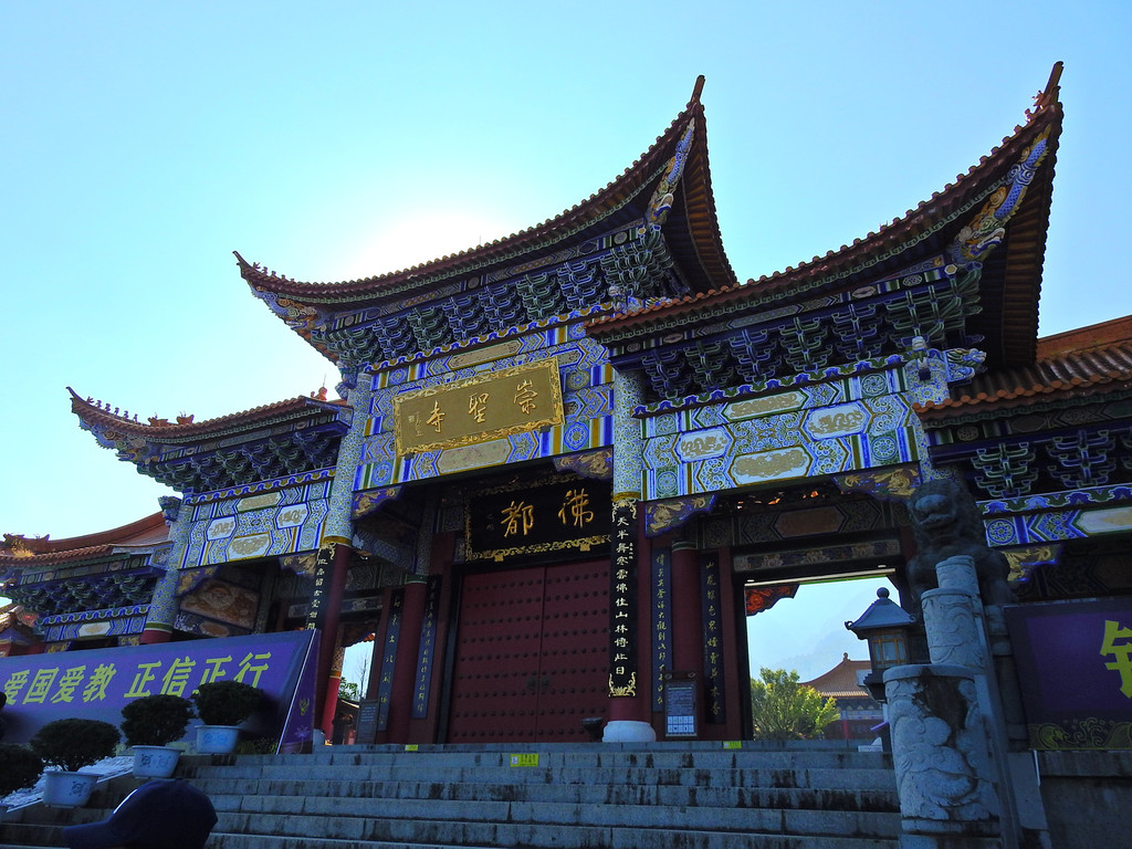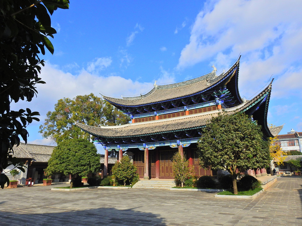 登上大殿的高处,不仅可以观看金碧辉煌的大殿琉璃瓦,还可以看到远处洱海