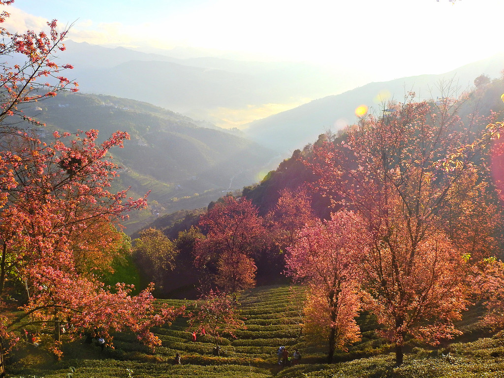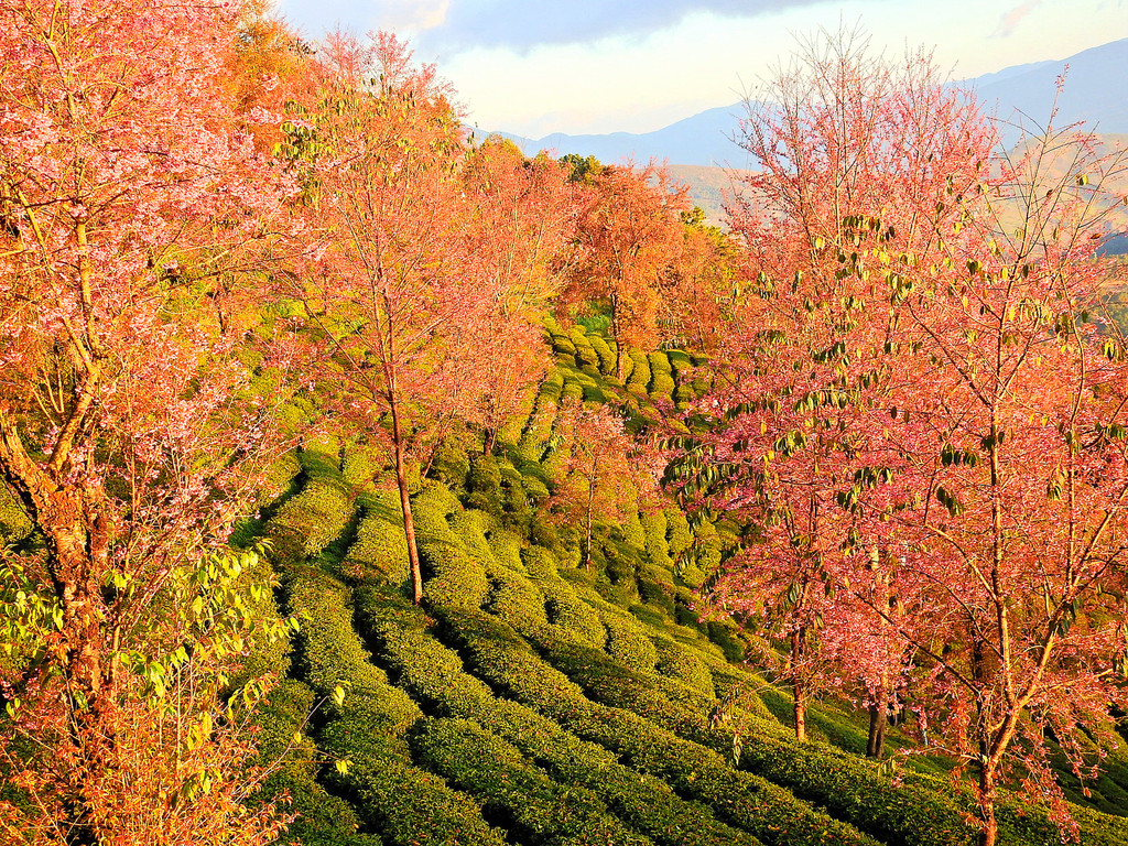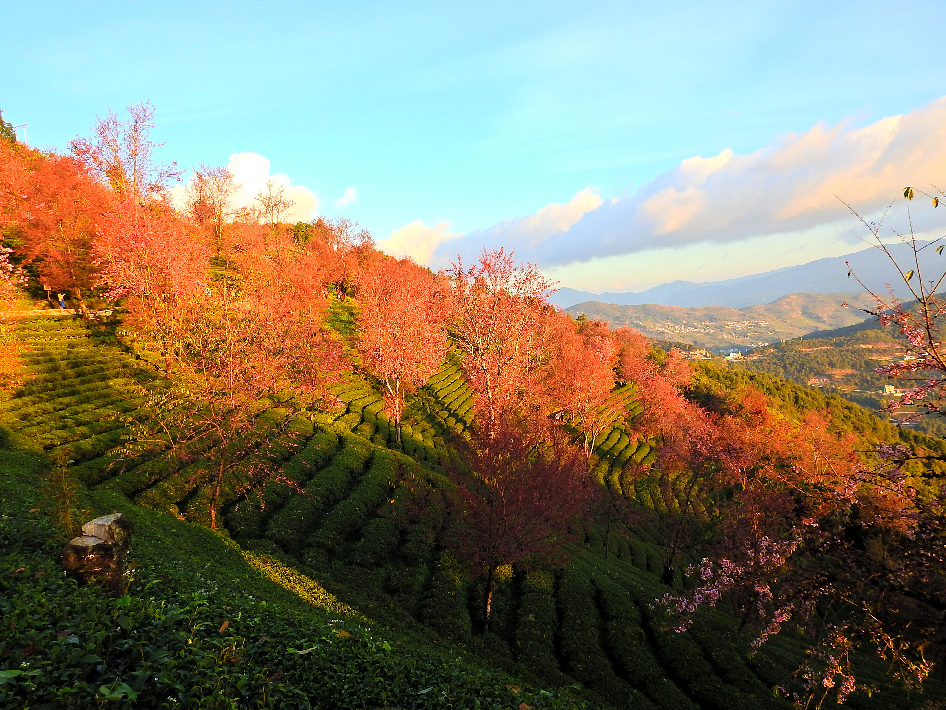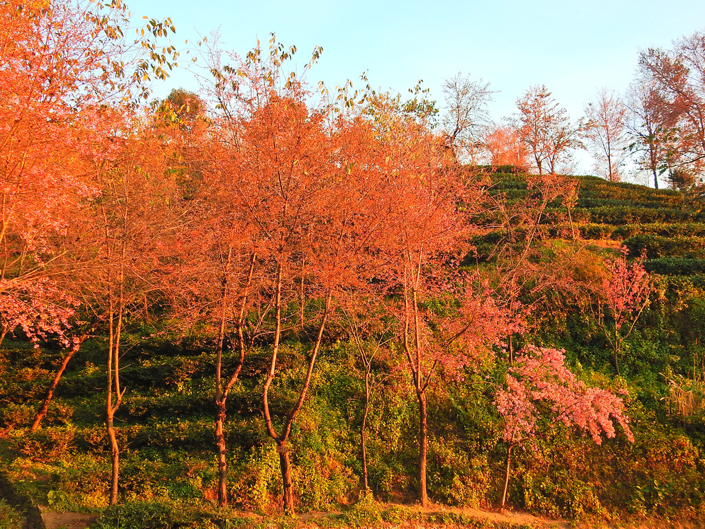 一直到太阳完全升起后,五彩斑斓的云彩才消失。随之而来的是另一番景象,晨曦初照中茶园冬樱花。