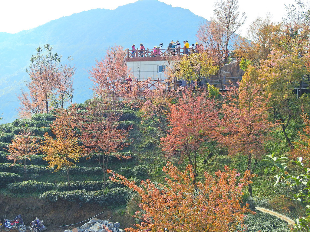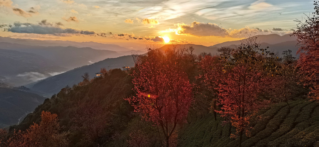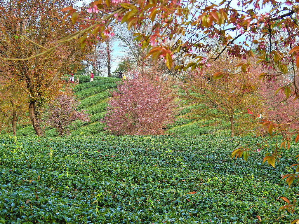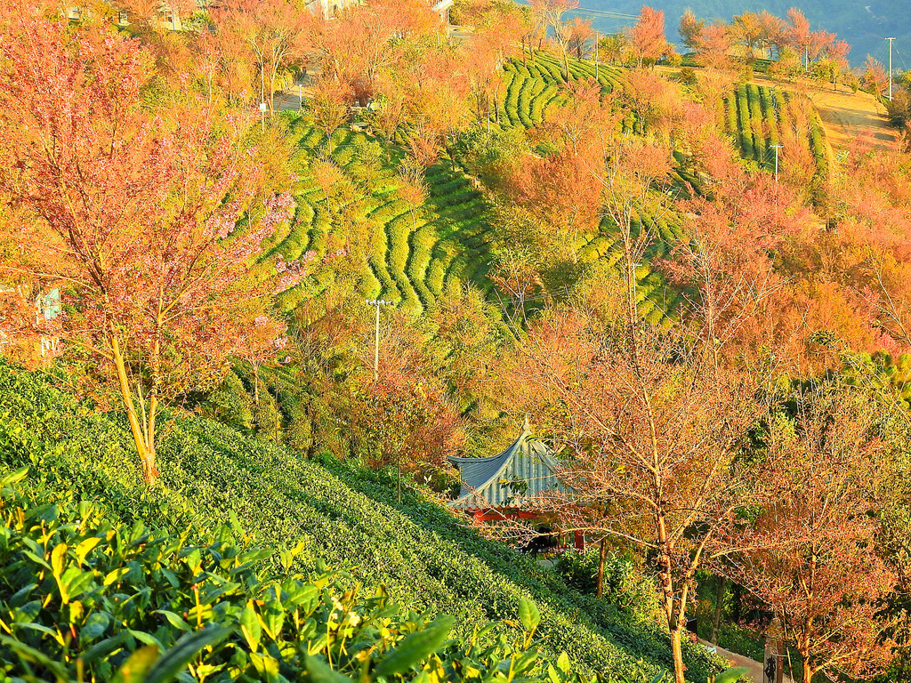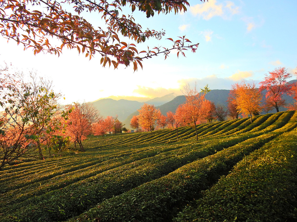 一直到太阳完全升起后,五彩斑斓的云彩才消失。随之而来的是另一番景象,晨曦初照中茶园冬樱花。
