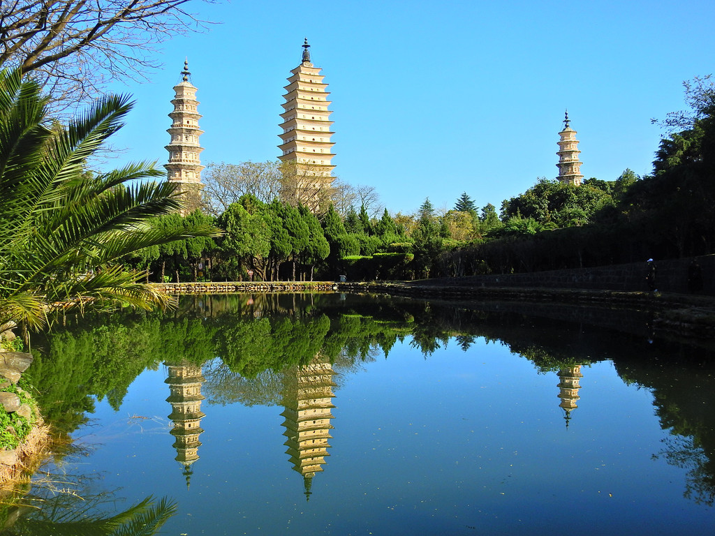 三塔倒影以其将大理的标志性象征——三塔与蓝天白云,日月星辰和四时鲜花包涵、融入其中的绝佳美景,令世界称奇赞叹、