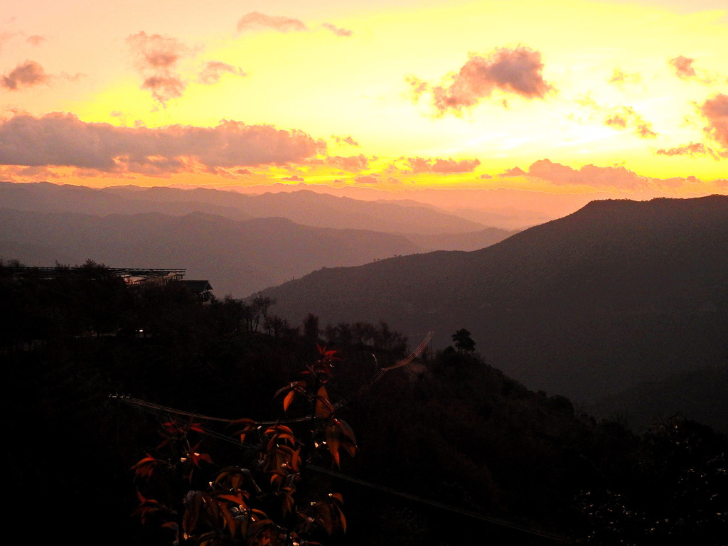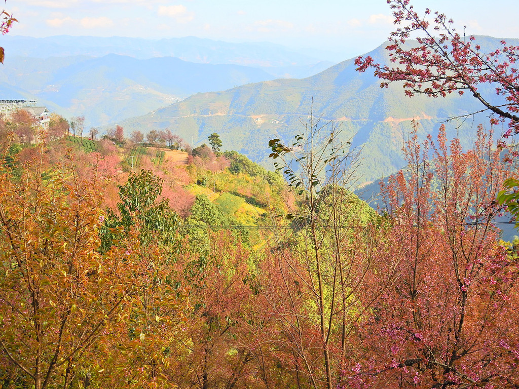 但推开窗户依旧春色满园。点缀在茶园中的冬樱花在暮色中依然娇艳。明天上午我们还是要下去看看。这一片是无量山樱花谷的梦幻园景区。风格与茗樱园略有不同。