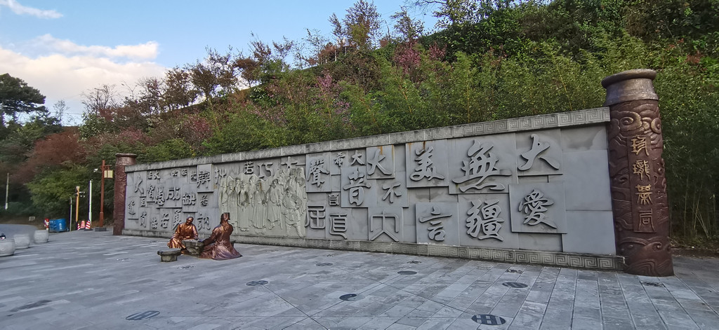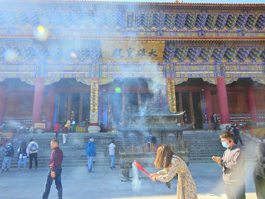 乘坐摆渡车直接到达的是大雄宝殿。大雄宝殿高大雄伟、金碧辉煌。在全国寺院中也是体量最大的殿堂。寺内金身佛祖高大令人叹为观止。而且四周墙壁镶有国内外绝无仅有的木雕长卷。非常值得观看。虽然整个寺院都不是古迹,但建筑规模却是让人震撼。