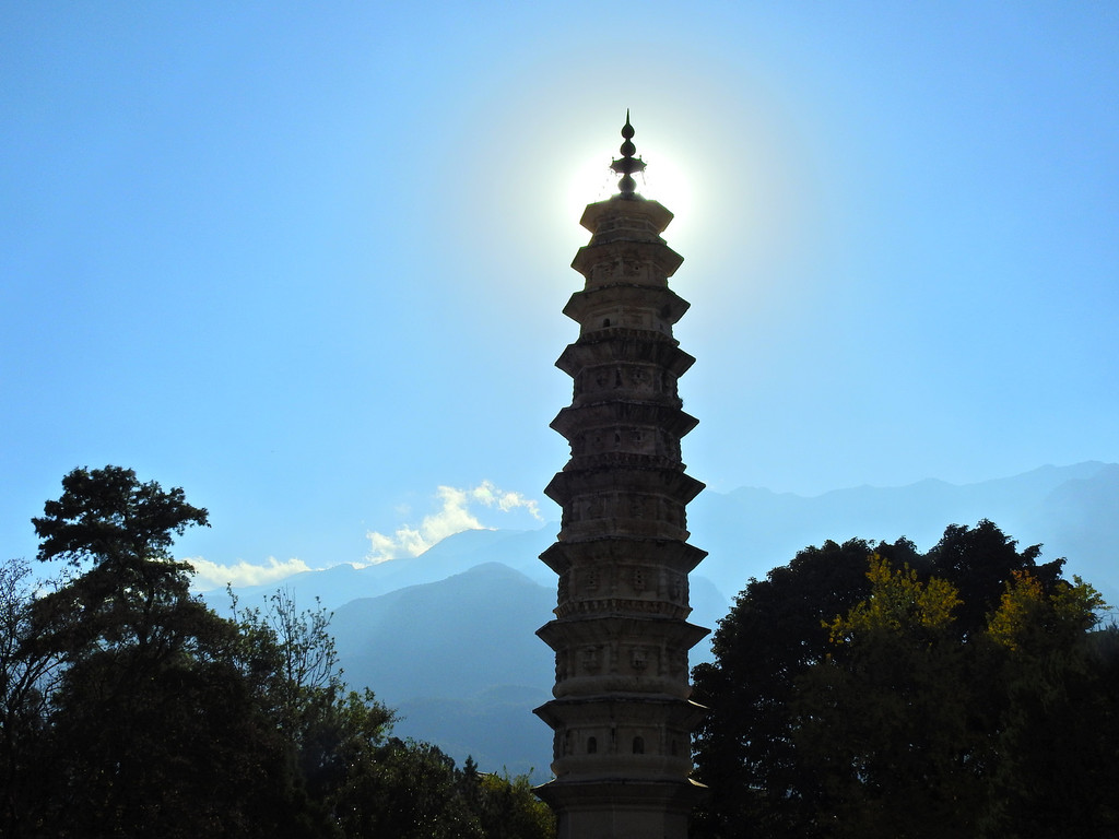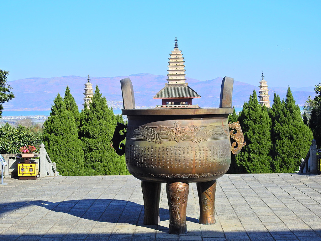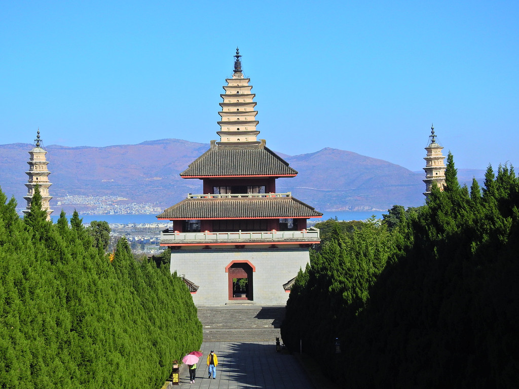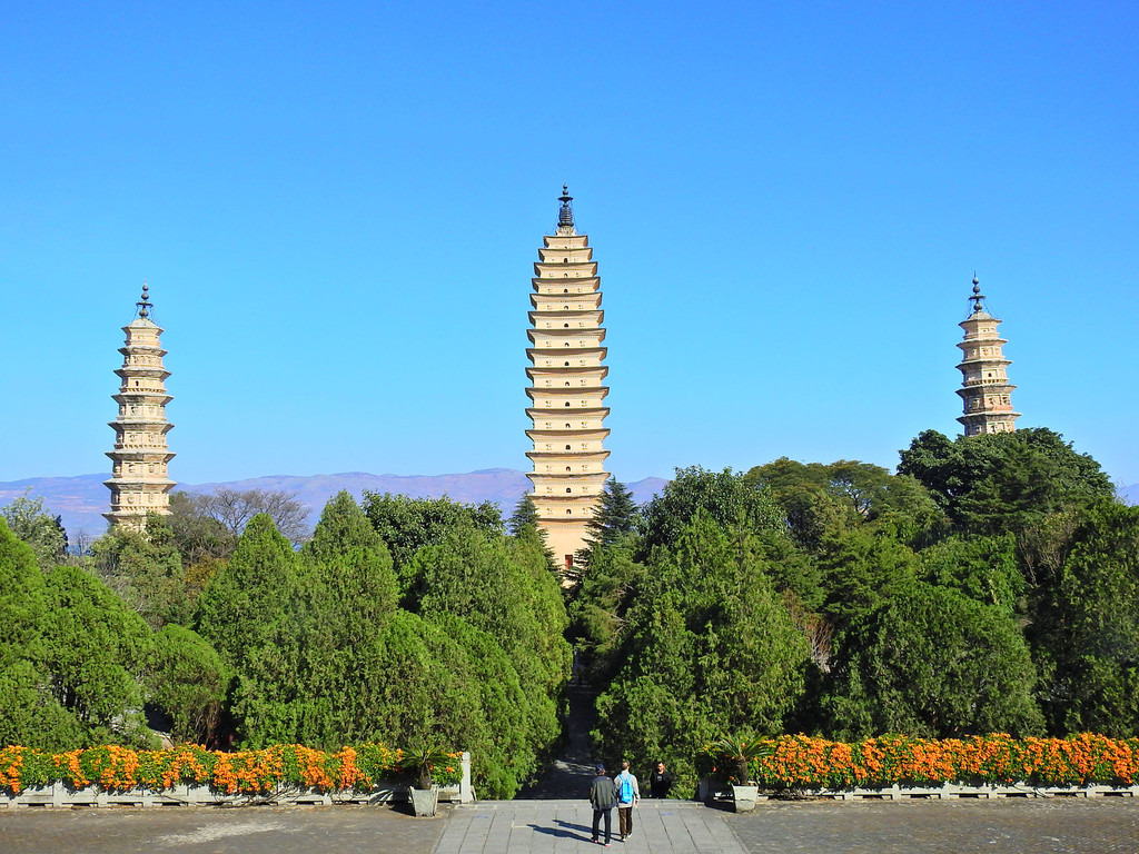 崇圣寺三塔,它是大理历史上规模最为宏大的古刹。也是大理的地标和象征。三座古塔鼎足而立,千寻塔居中,二小塔南北拱卫,雄伟壮观,显示了古代劳动人民在建筑方面的卓越成就以及美感。三塔互相依衬,浑然天成,背后是雄伟壮观的苍山,前面是碧波荡漾的饵海,依山傍海古人可真是会挑地方。