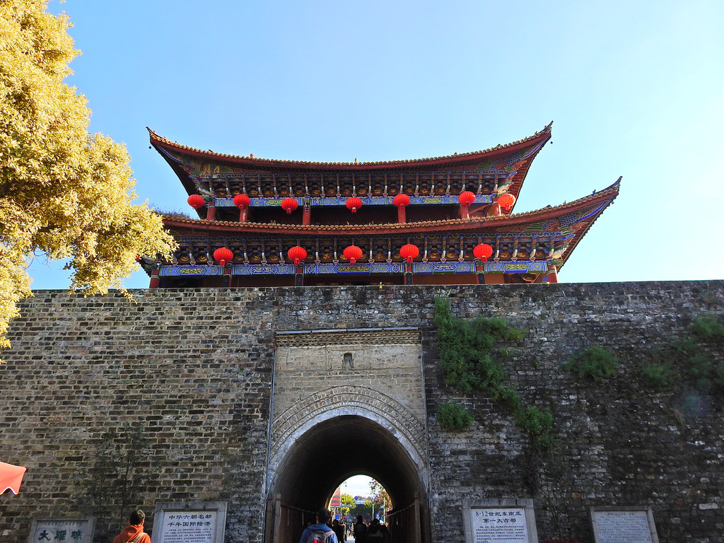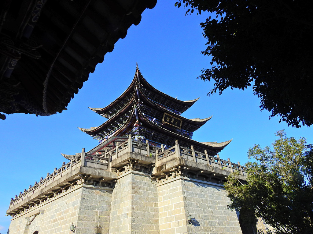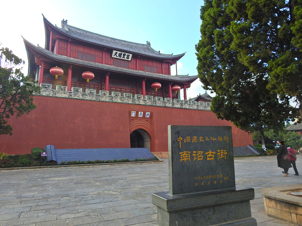 南城楼称双鹤楼又称承恩楼。南城门是古城四门之首,南城楼始建于明洪武十五年(1382年),为古城最古老雄伟的建筑,是大理古城的象征和标志。城门上"大理"二字是郭沫若1961年游览大理时亲笔所提