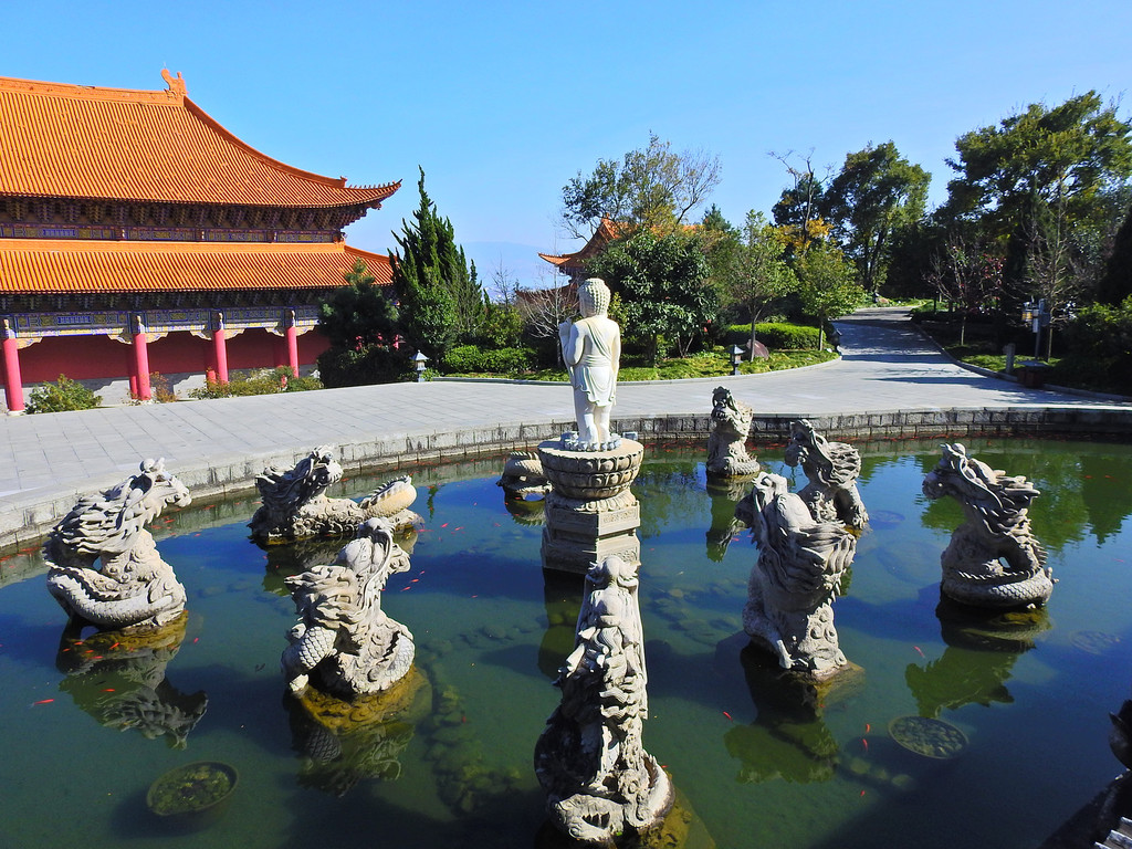 大雄宝殿后面是观音殿和弥勒殿。殿前有一池,即“九龙浴太子”石雕群