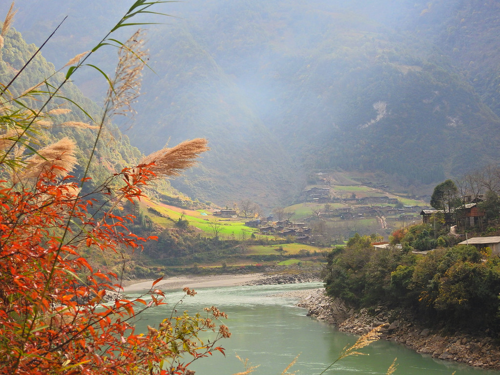 这是一条穿行于谷底江边的路。