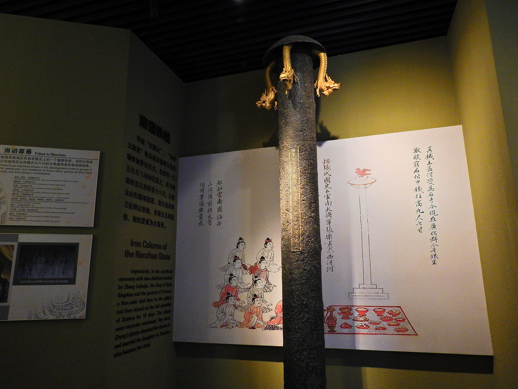 南诏铁柱--传说当年邀请九位首领前来参加祭奠,有一只五色鸟落在了上面。从此众心归顺。