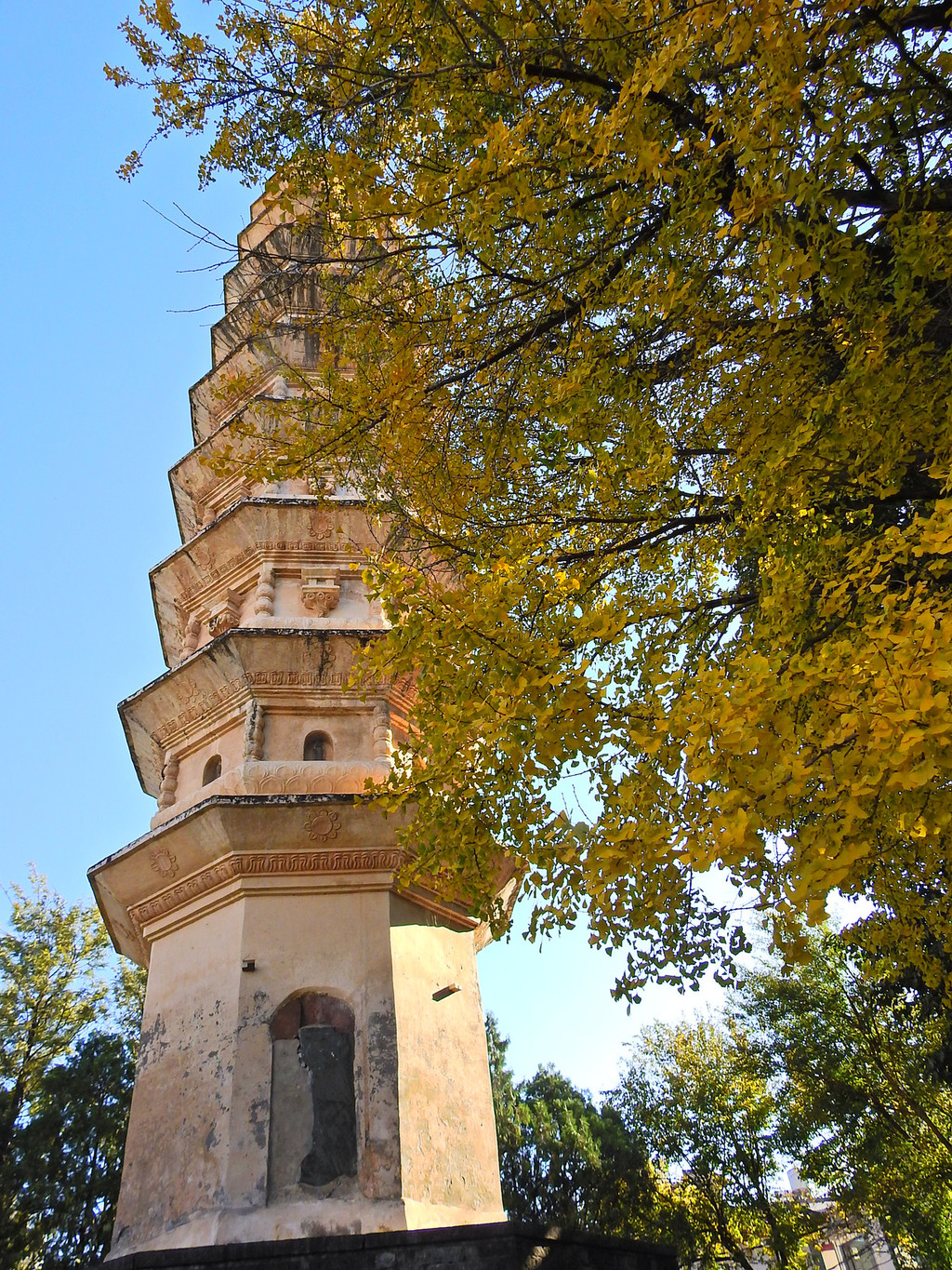 看来日子有点晚,银杏树的叶子已经快落光了。否则衬托在蓝天白云下一定很美
