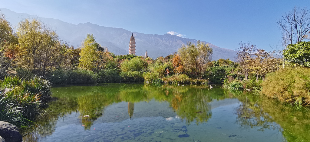 在离公园出口处不远处,有一处最佳拍摄位置。周围绿植花卉环绕,三塔背靠苍山映衬在湖面上甚是美观