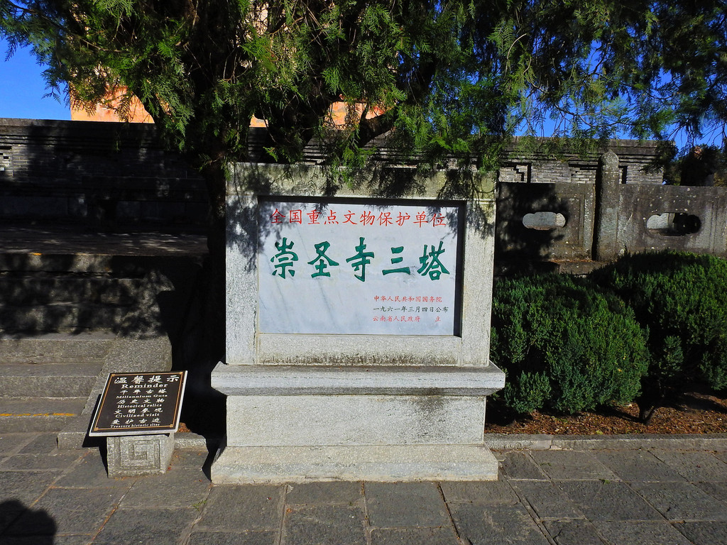 崇圣寺三塔的基座为方形,四周有石栏,栏的四角柱头雕有石狮,其东面正中有块石照壁,上书“永镇山川”四个大字,每字1.7米,笔力雄浑苍劲,气势磅礴。