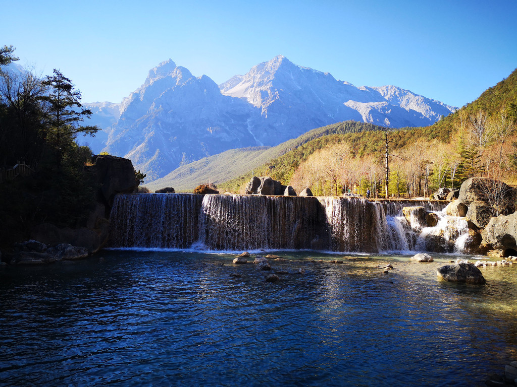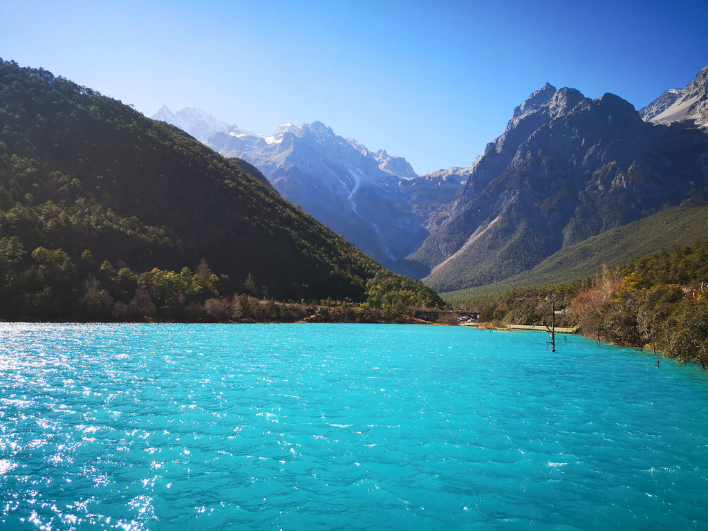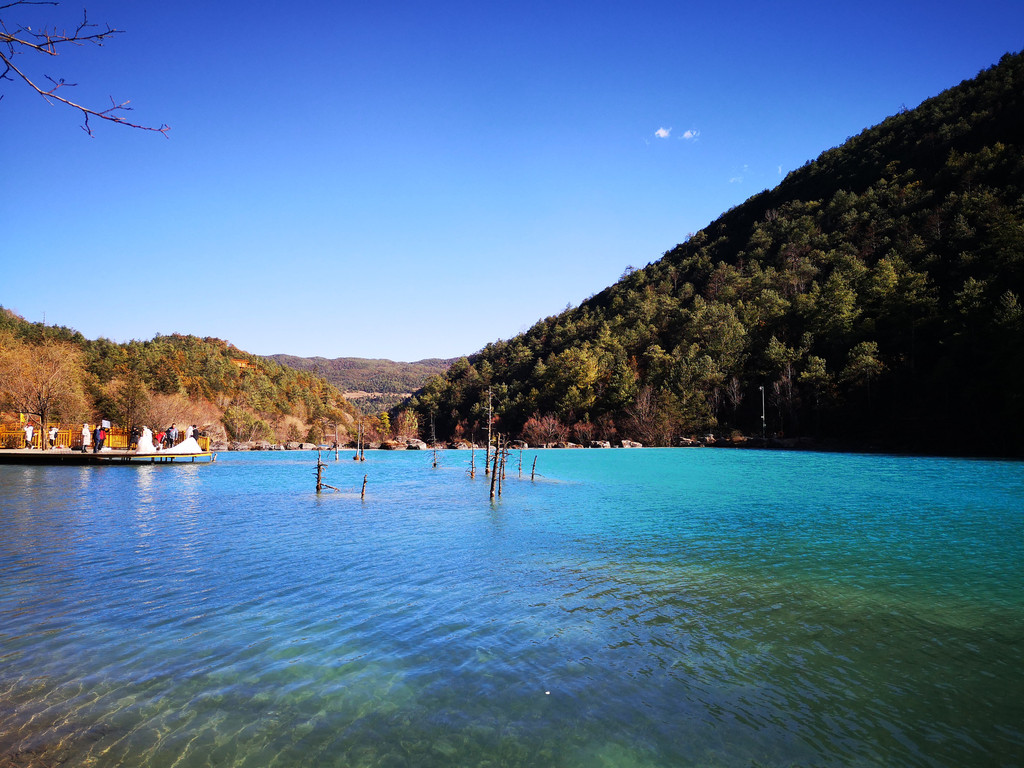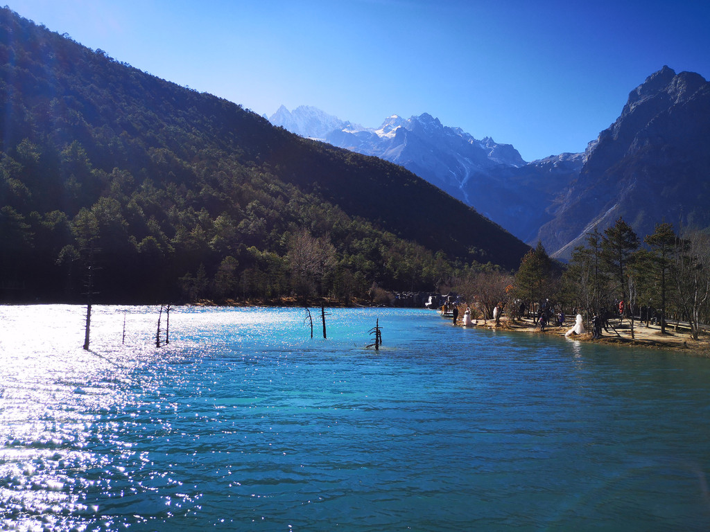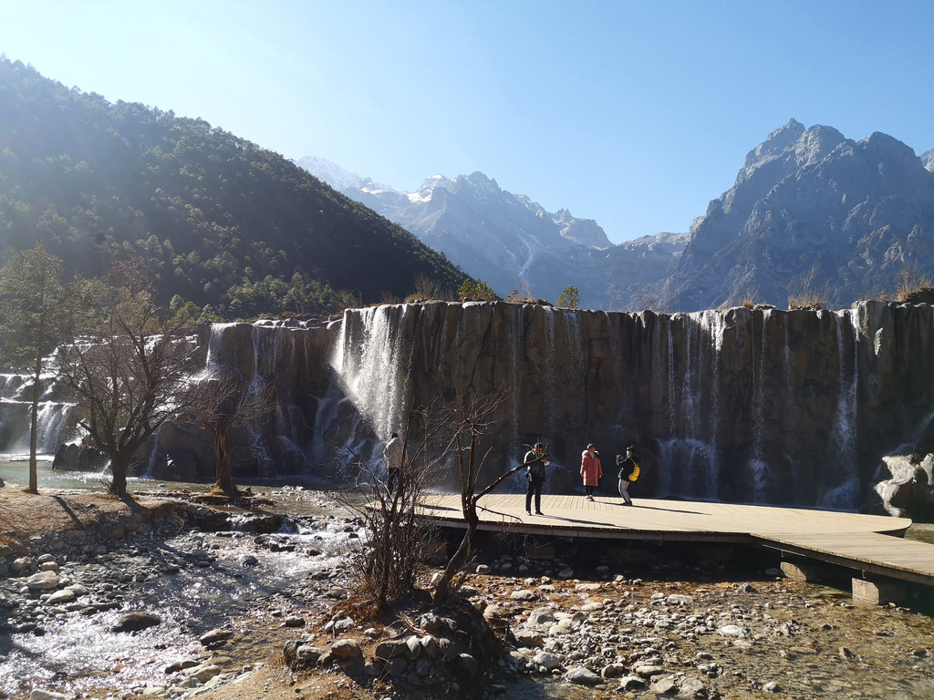 下午到玉龙雪山和蓝月谷,这个季节去玉龙雪山其实风险很大,经常会封山,因为风很大,会让登山索道摇晃的特别厉害,比较危险,12月份或2月份好像天气会好一些,但也要看运气,我们运气不好,当天风很大,玉龙雪山最后还是封了,大家都改到了旁边的蓝月谷游玩,蓝月风景不错,水里有一种物质导致湖水成蓝色,后来听导游还是谁说的,蓝月谷是人为调出来的颜色,不过挺漂亮的;