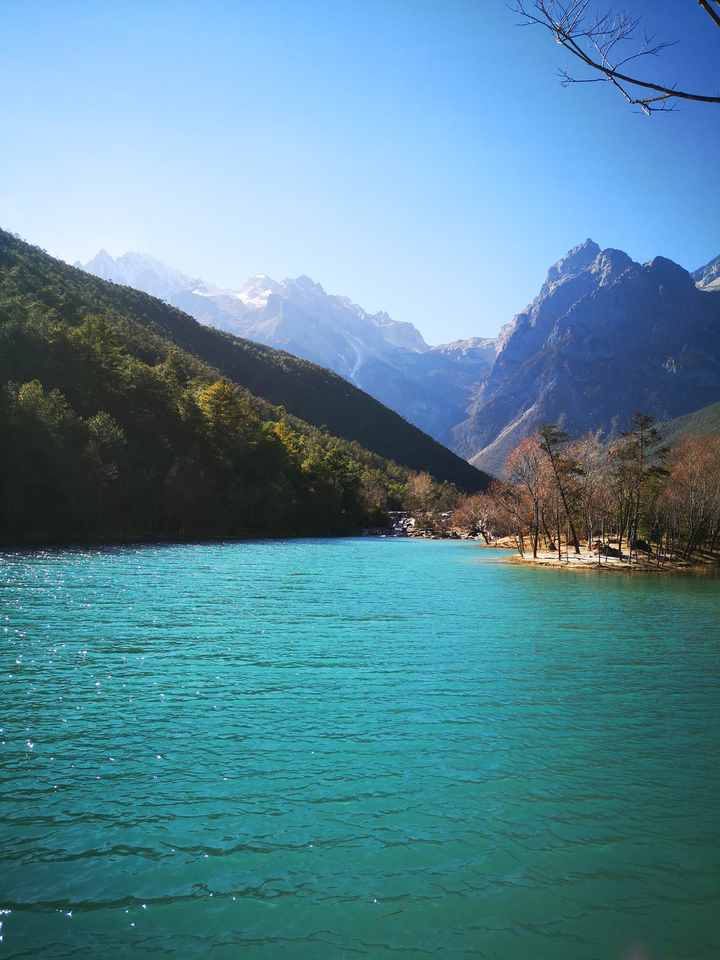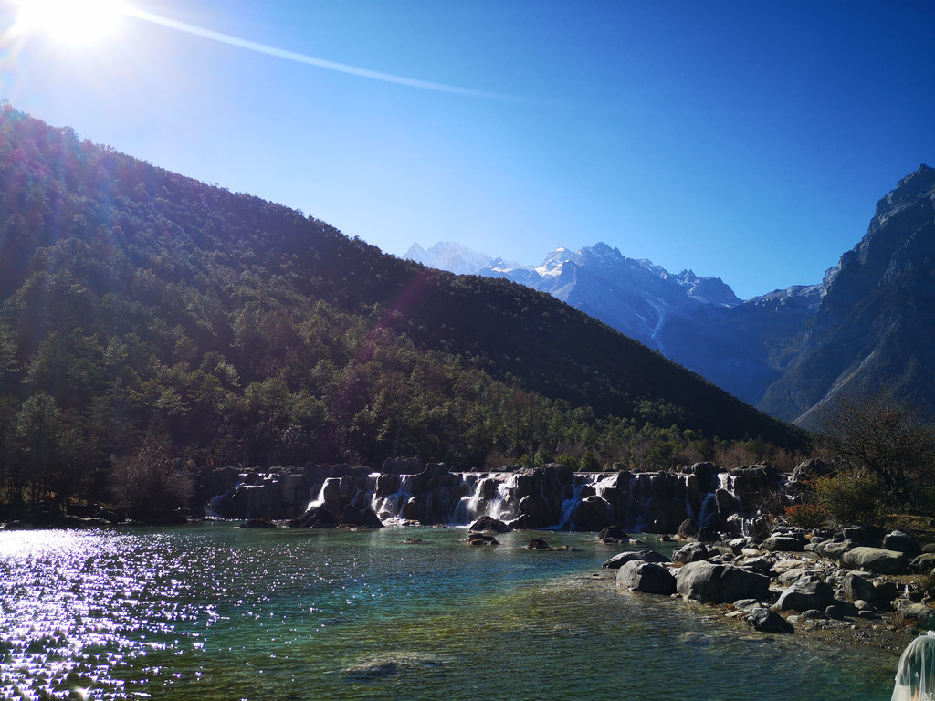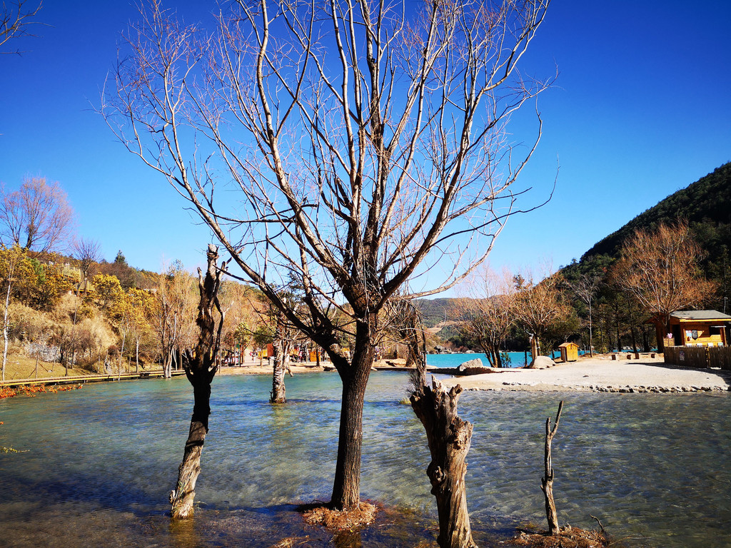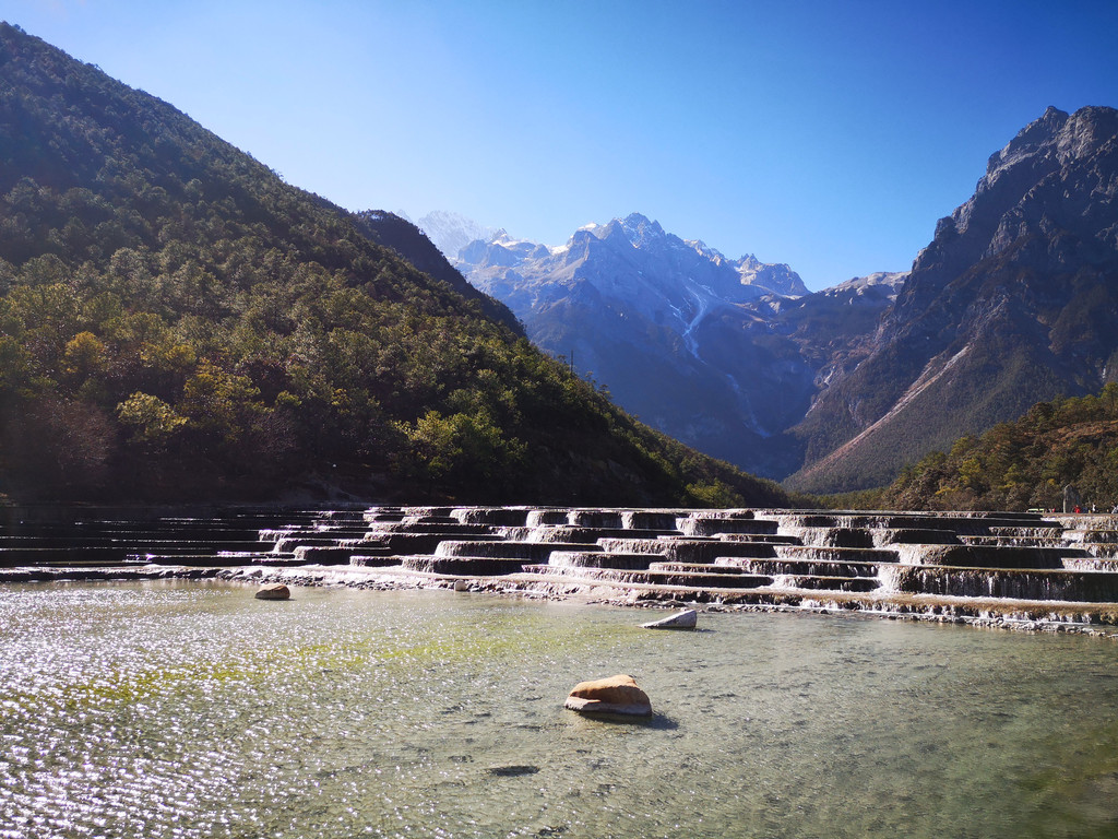 下午到玉龙雪山和蓝月谷,这个季节去玉龙雪山其实风险很大,经常会封山,因为风很大,会让登山索道摇晃的特别厉害,比较危险,12月份或2月份好像天气会好一些,但也要看运气,我们运气不好,当天风很大,玉龙雪山最后还是封了,大家都改到了旁边的蓝月谷游玩,蓝月风景不错,水里有一种物质导致湖水成蓝色,后来听导游还是谁说的,蓝月谷是人为调出来的颜色,不过挺漂亮的;