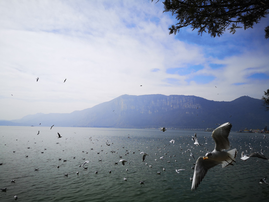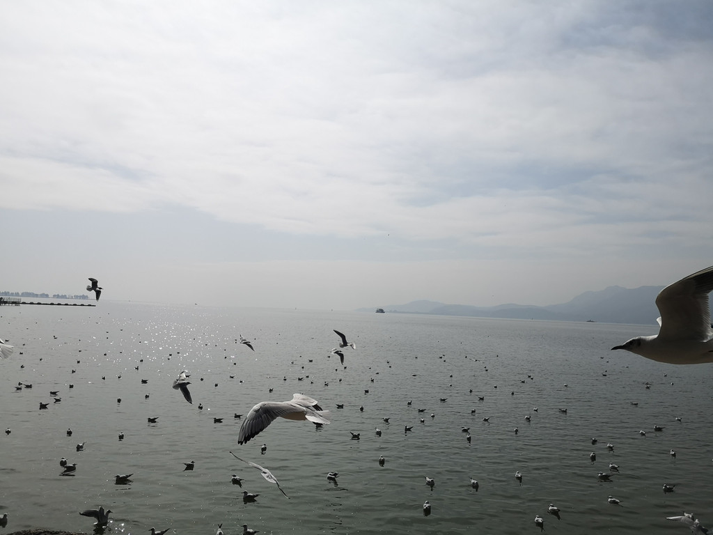 很多人在滇池坝上喂海鸥,可以把食物拿在手里,海鸥会凌空夺食。