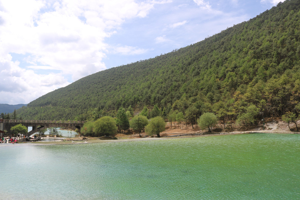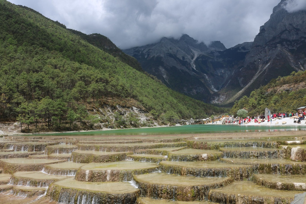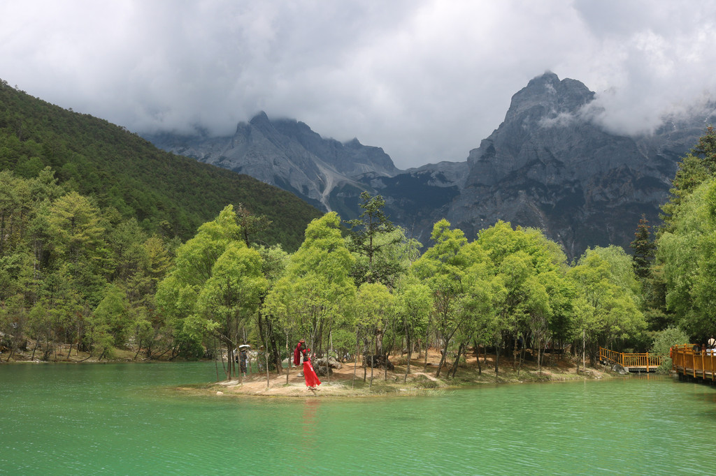 蓝月谷的水其实不蓝,是清澈的绿,水流一路蜿蜒而下,周围是枝叶茂盛的树林,望过去绿意盎然的一片,配上云雾缭绕的雪山作背景,养眼至极。