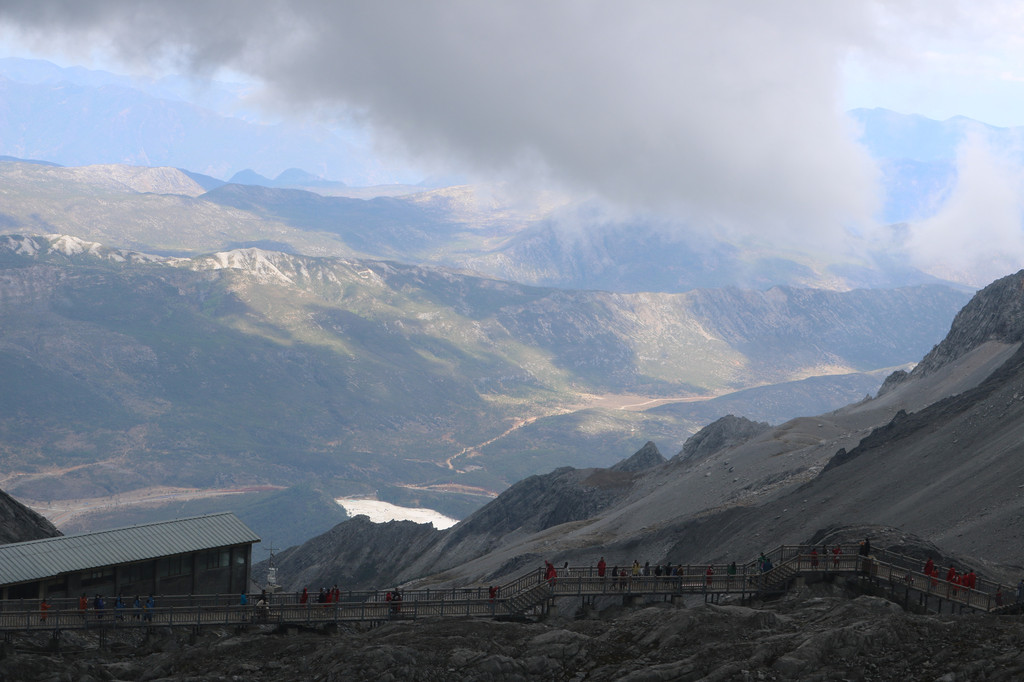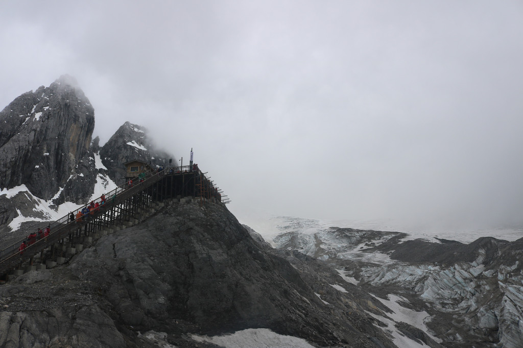 在天气明朗的3365米站台坐索道到达4506米的平台后,突然下起了小雨,乌云笼罩,停留片刻后大家往栈道继续前行,像在迷雾中穿梭,走走停停休息,高原反应因人而异,需量力而行。
