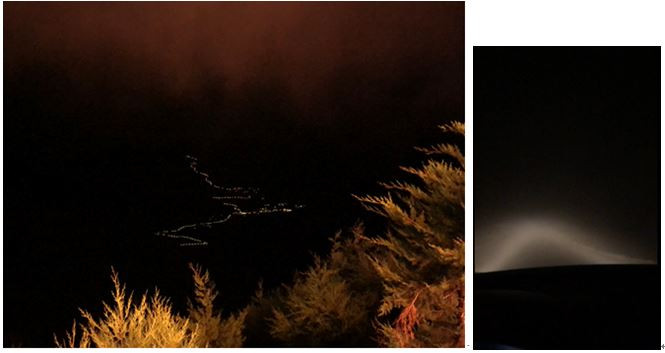 雨季天黑的早,大约19点多,天就黑了。在翻山途中,黑天遇到浓雾,打开远光灯的能见度也不足10米。我发现有一些车打着双闪停在路边不敢开了。看来他们是没有经验,认为等一等雾就会散开了,其实在山里有雾的地方就总会有雾,这些地方的雾气也不会短时间就能散开。你本身就看不清路,山路弯弯绕绕,急转弯一个连着一个,停车的位置也不一定安全,最好的办法是慢慢开过去,如果连这点功夫都没有,那就最好别跑到这地方来开车了。夫人有些担心,在旁边双手合十不停的叨念着,每次开车遇到险情,她都会以这种方式守护我的安全,每次都能化险为夷。我的车速略减,不是害怕,是为了用手机拍一段大雾视频(右下图),有点夸张哈。翻过这座山就是德钦,尽管有过经历,但在视线遇光的瞬间,我还是被眼前看到的仙境给迷住了。夜色中,云雾缭绕,灯光是开散成一片一片的,房屋与云雾在同一水平线上,不由得让我产生了幻觉,仿佛身在天宫中。哇呜,哇哇……
